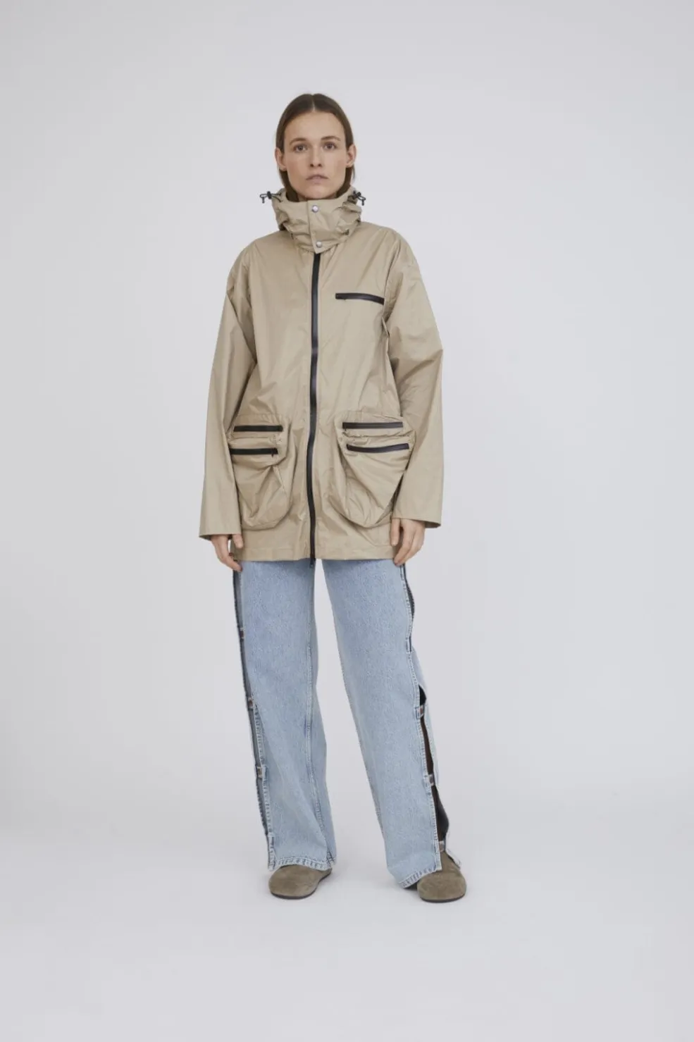 Sandfarvet regnfrakke fra H2O Fagerholt i let nylon. Den høje hals og lynlåslukning giver god beskyttelse mod regn og vind.