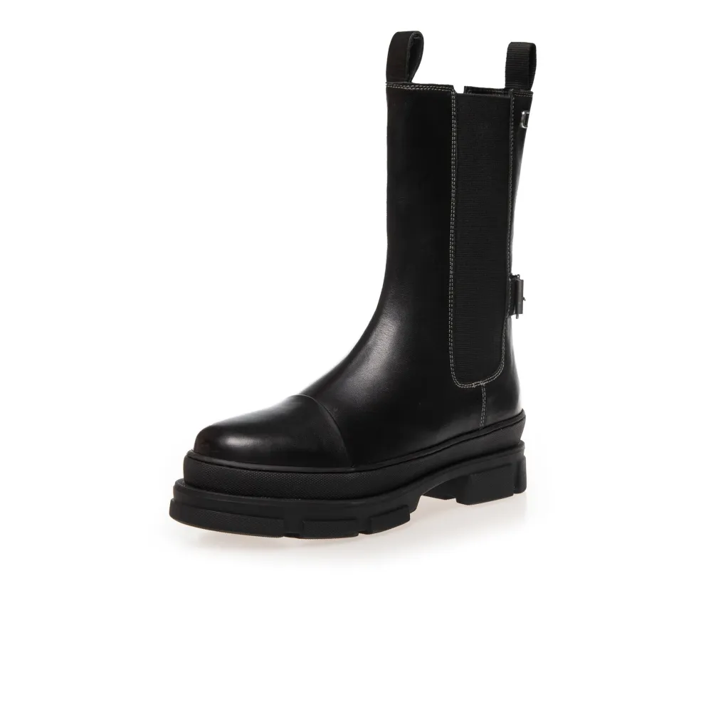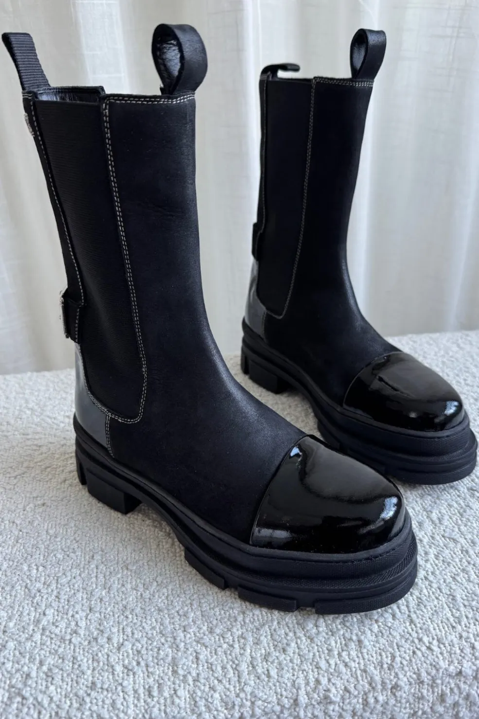 Sort ankelstøvle med en kombination af mat læder og blank patentoverflade på tåen. Støvlen har elastiske sider og en kraftig sål med blokhæl.