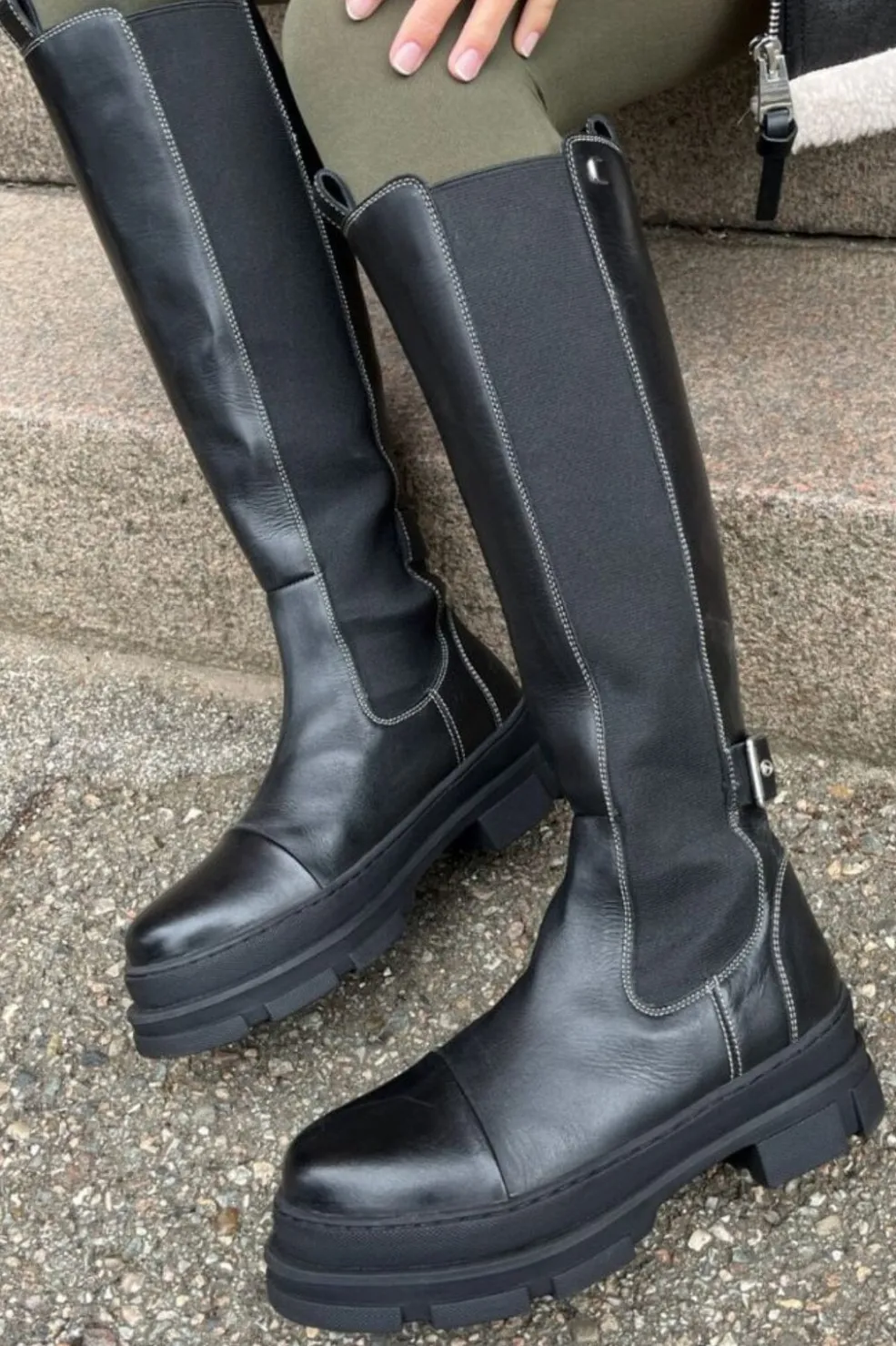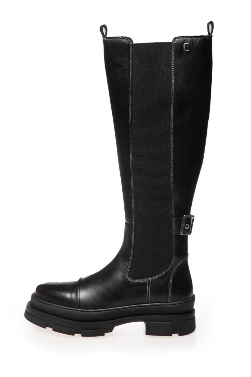 Sort knæhøj støvle med robust sål. Støvlen kombinerer læder og elastisk tekstil i skaftet med en praktisk lav hæl. Den har en solid konstruktion med en tyk sål.