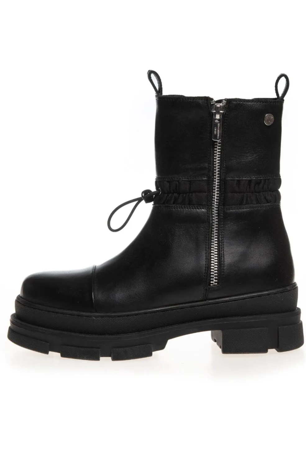 Sorte ankelstøvler fra Copenhagen Shoes i læder med chunky sål. Støvlerne har både lynlås på siden og snøredetalje øverst, hvilket gør dem nemme at tage af og på.