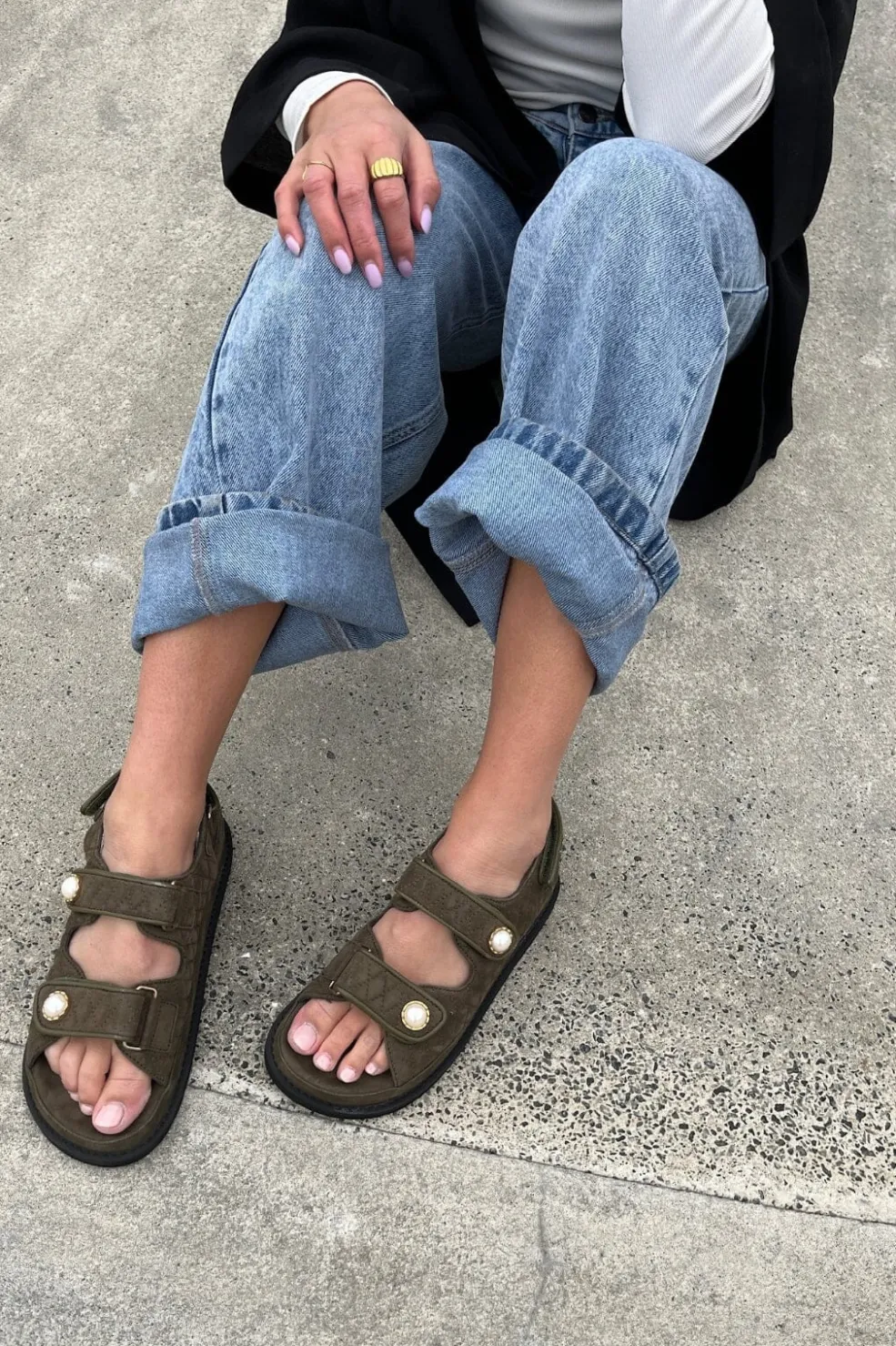 Armygrøn sandal i ruskind fra Copenhagen Shoes. Sandalen har perledetaljer på remmene og en åben tå med velcrolukning.