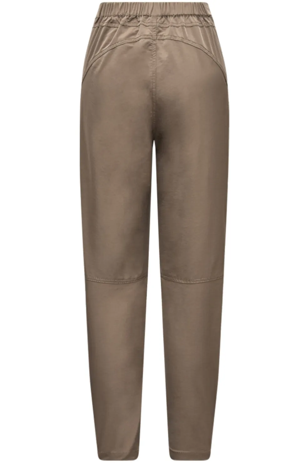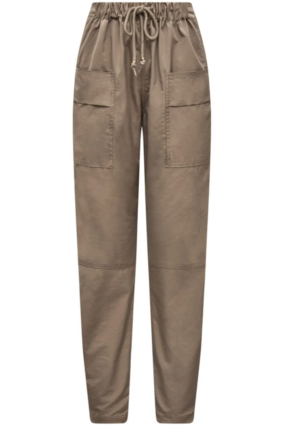Bukser fra Gossia i mørk kamel med høj talje og løs pasform. De har elastik og bindebånd i taljen samt store lommer foran. Bukserne er i ankellængde med et afslappet design.
