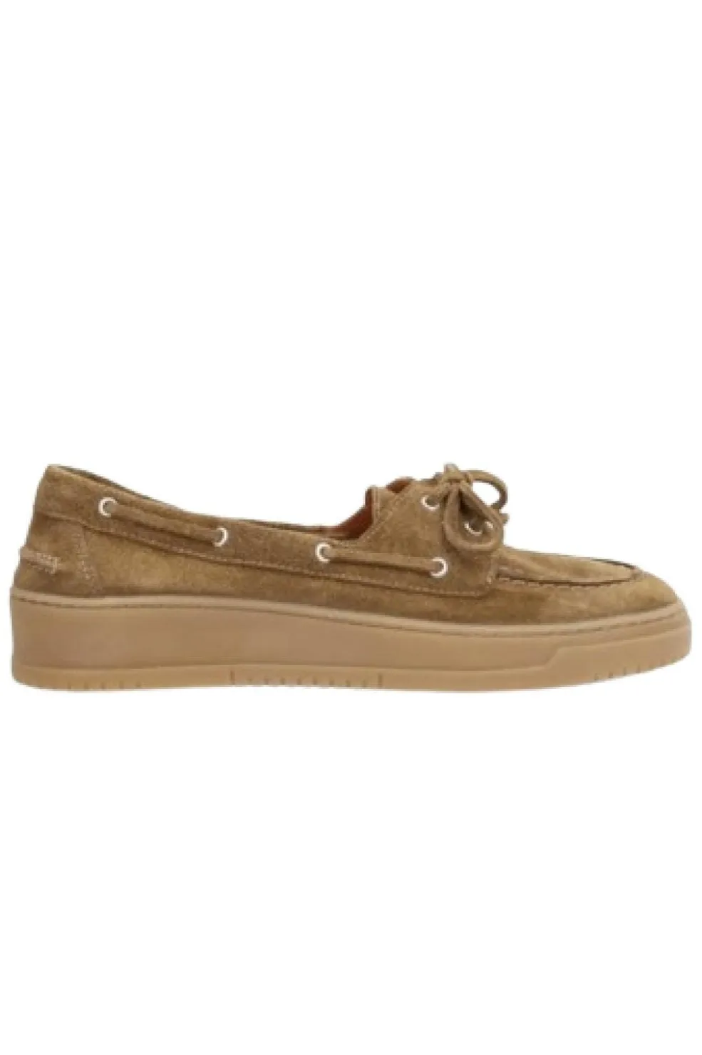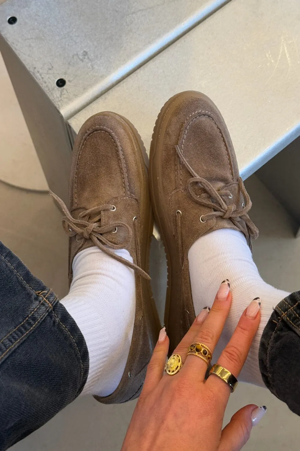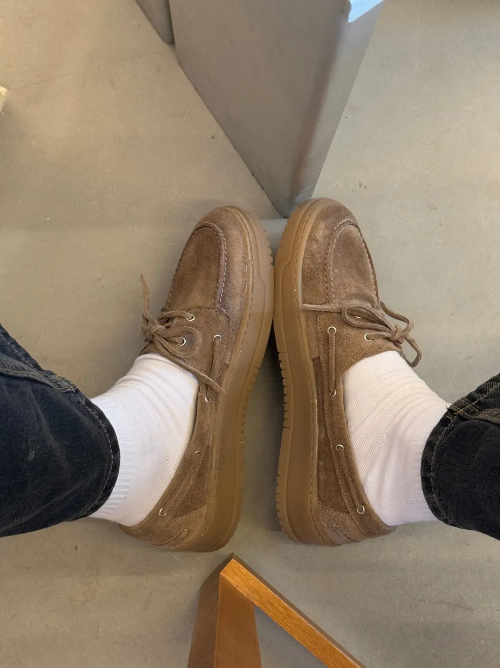 Brun sko fra Phenumb Copenhagen i ruskind med rund tå og snørebånd. Skoen har en lav hæl og en solid konstruktion, der gør den praktisk til hverdagsbrug.