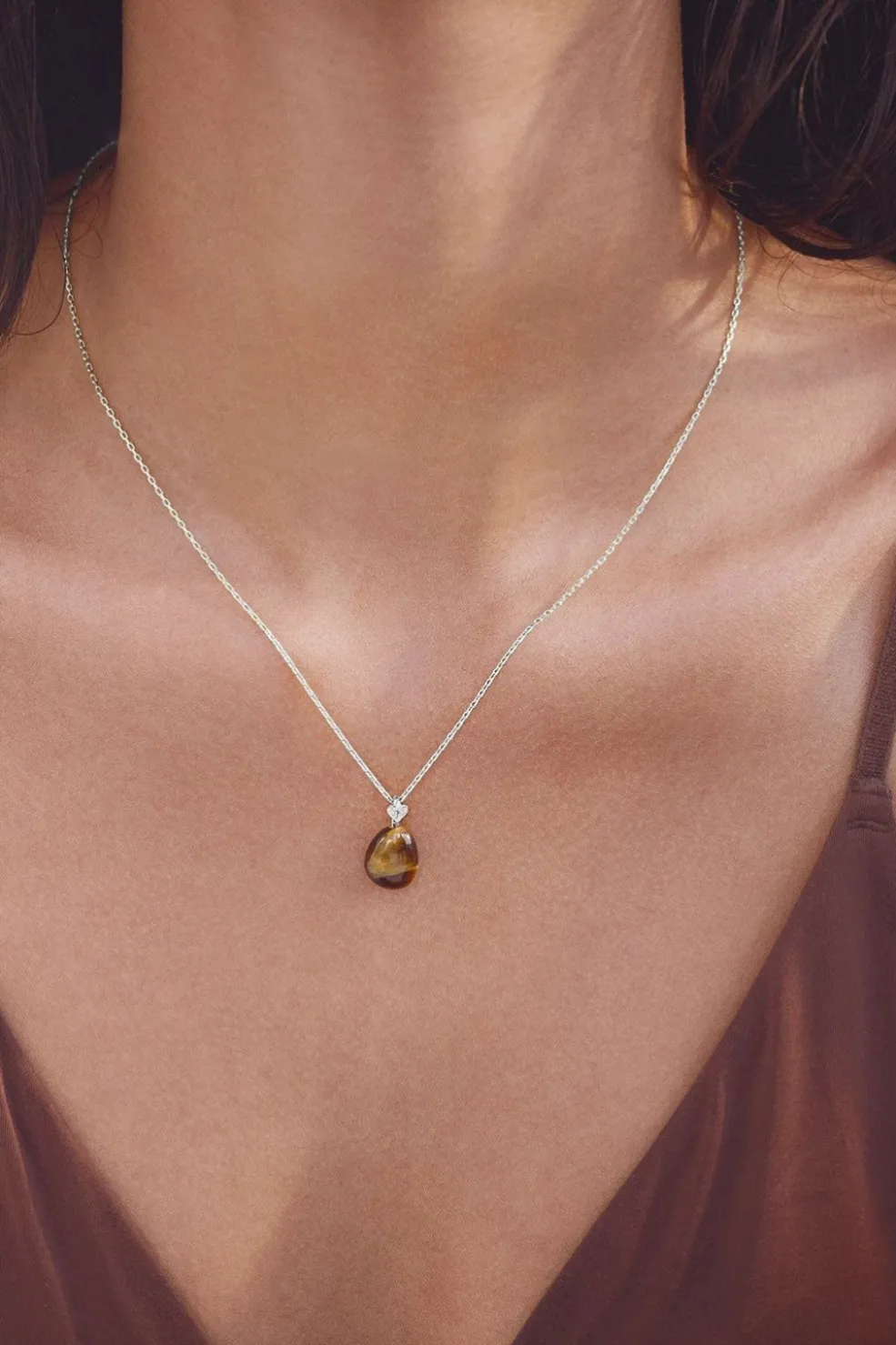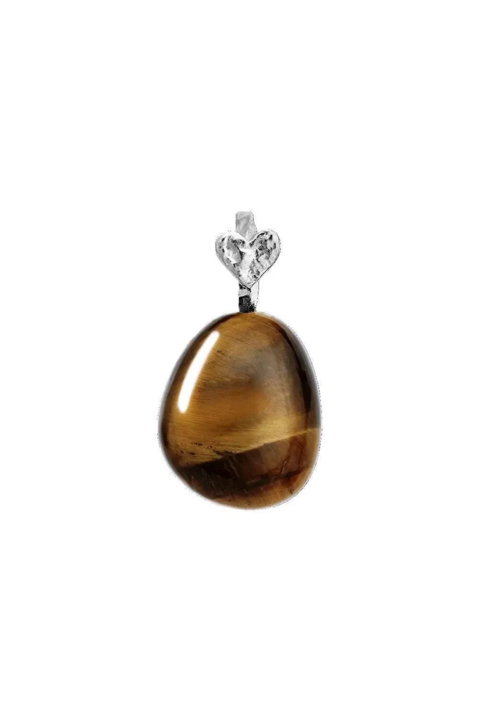 Vedhæng fra Maanesten med en dråbeformet tigerøje-sten i guld og brune nuancer. Stenen har et stribet mønster og en glat overflade. Vedhænget har et hjerteformet ophæng.