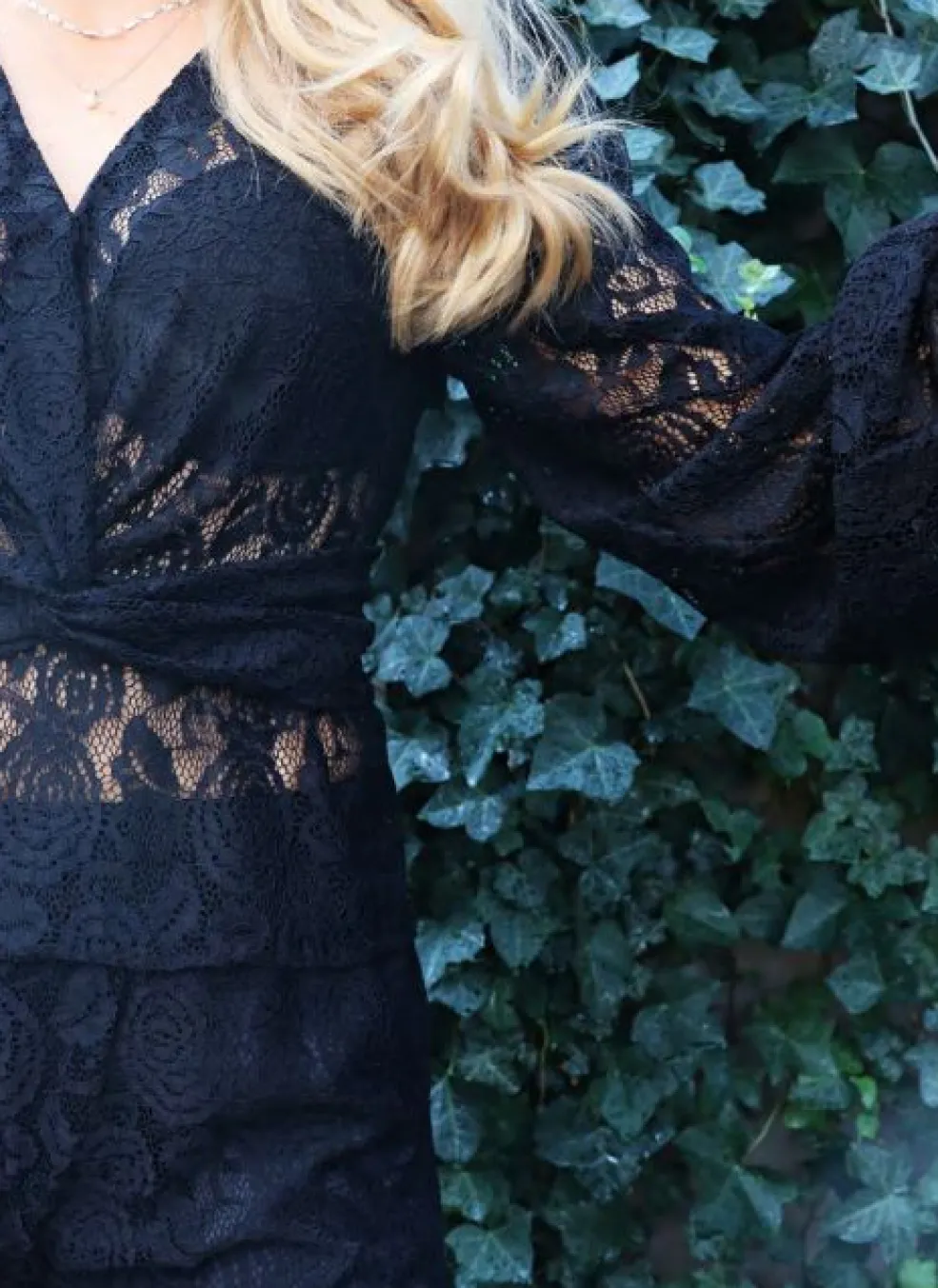 Sort bluse fra Liberte med blonde i blomstermønster og twist-detalje foran. Blusen har lange ærmer og V-hals.