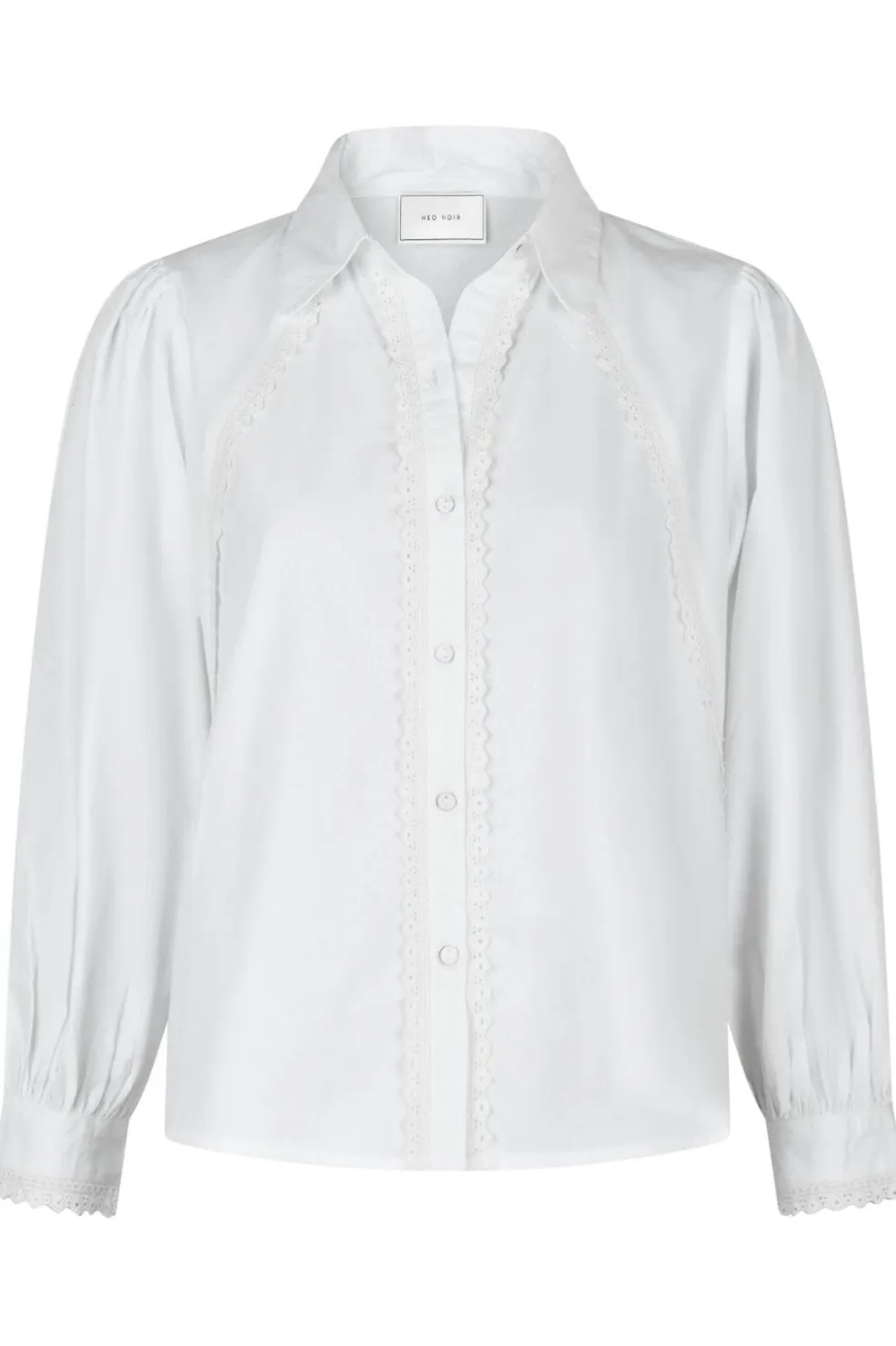 Hvid poplinskjorte fra Neo Noir med pufærmer og blondedetaljer. Skjorten har en skjortekrave og knaplukning med dekorative blondekanter langs fronten.