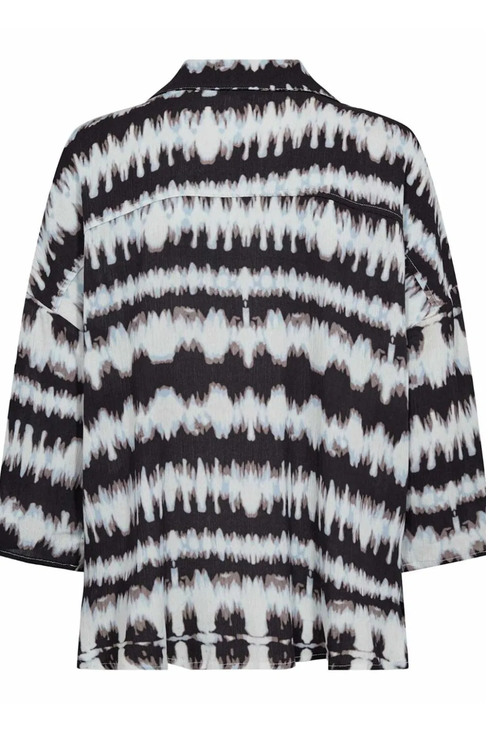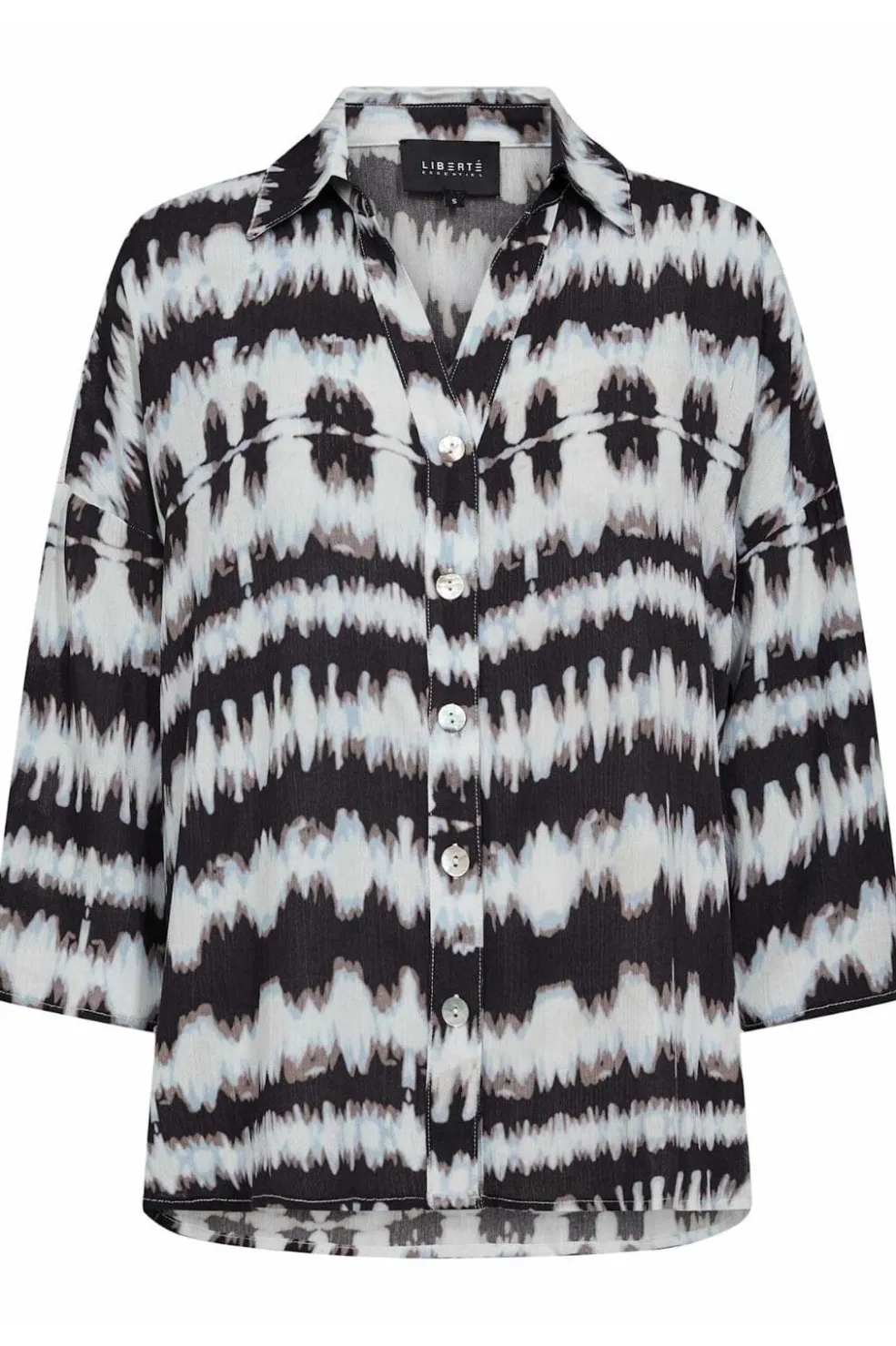 Skjorte fra Liberte med sort og blåt tie-dye-mønster. Den bølgende farvekombination giver skjorten et kunstnerisk præg, mens skjortekraven og knaplukningen holder designet klassisk.