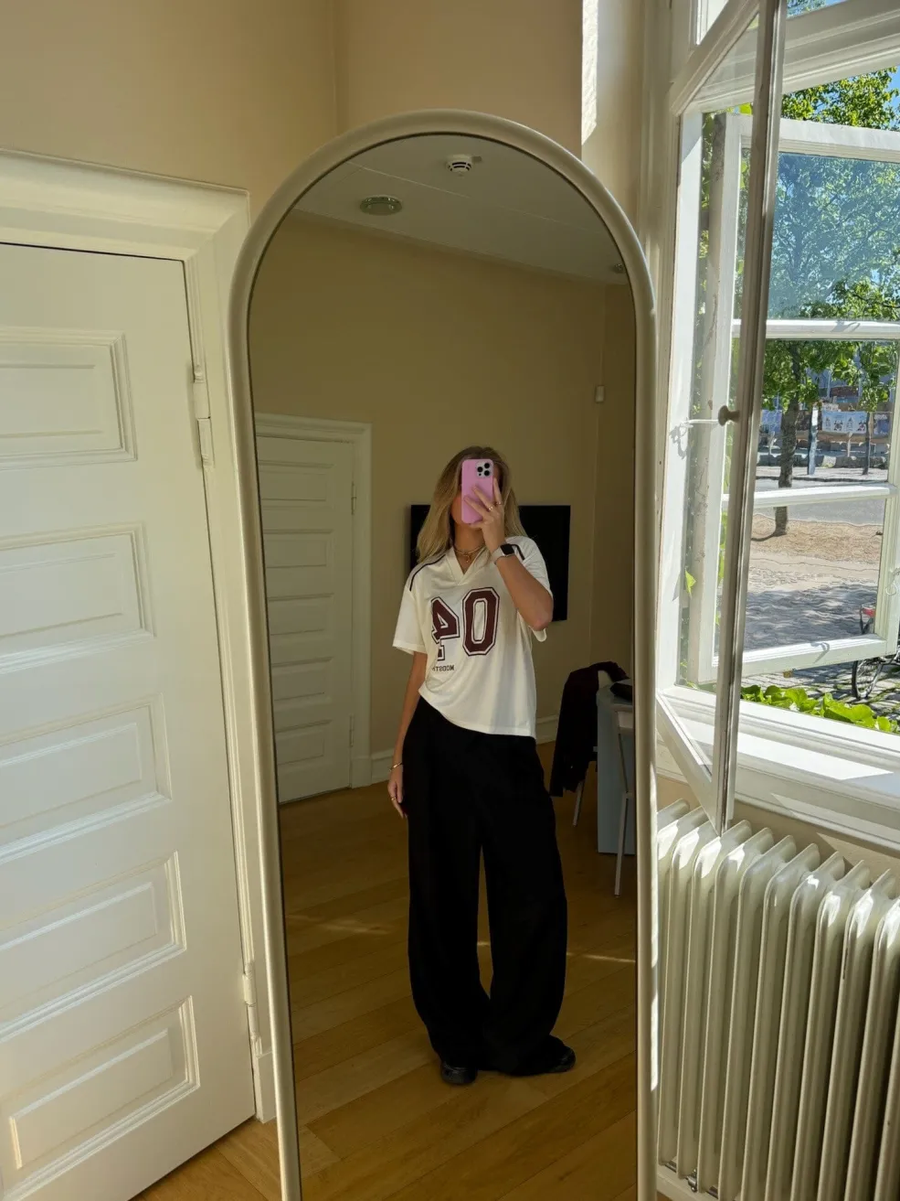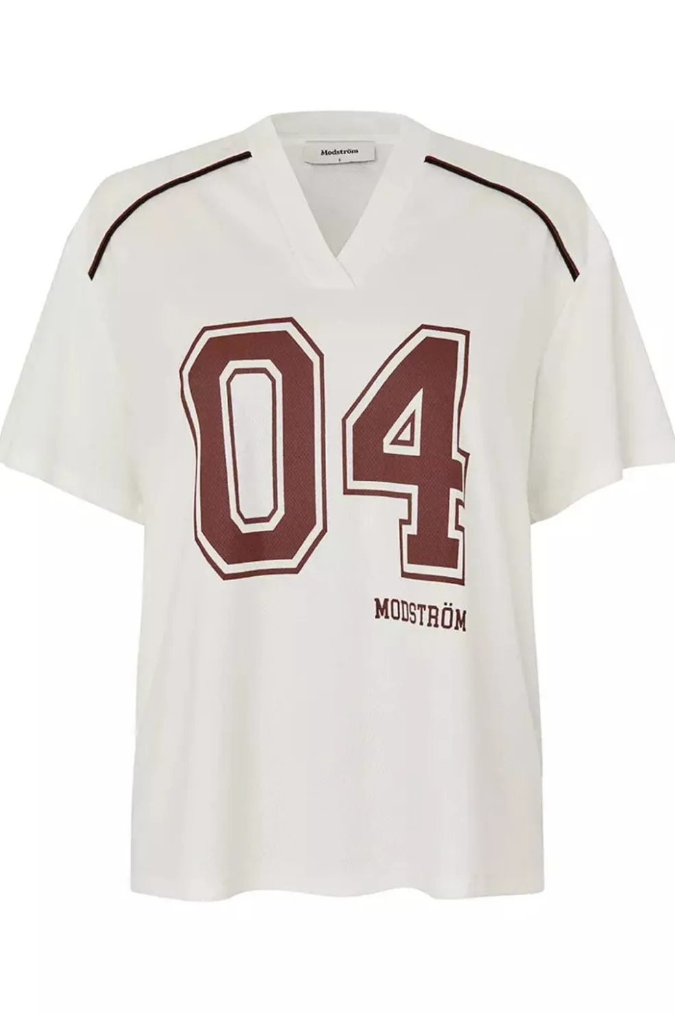 Cremehvid t-shirt fra Modström med sporty design. T-shirten har et stort 04-print på forsiden og bordeauxfarvede pipingdetaljer ved skuldrene og ryggen.