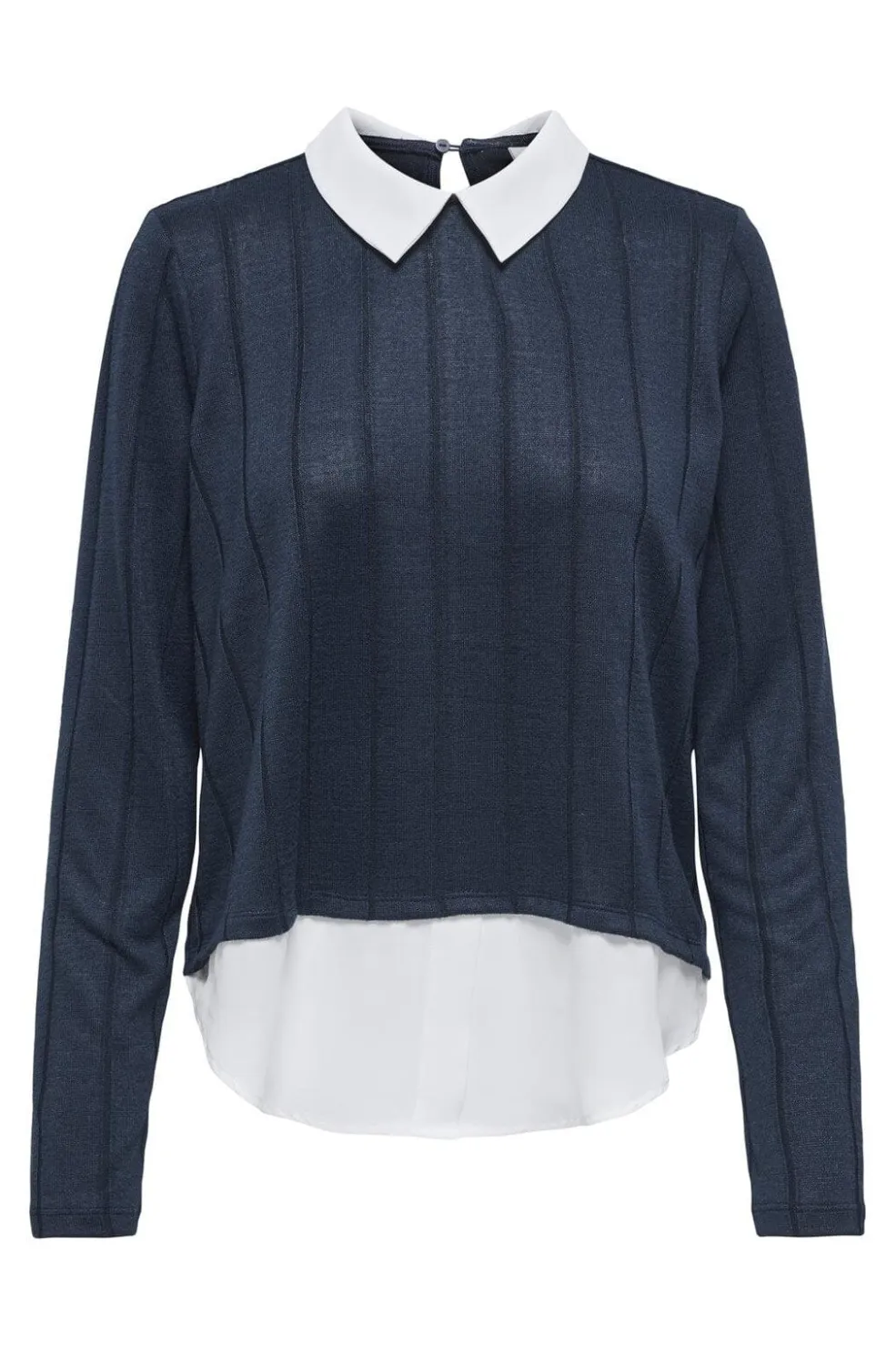 Mørkeblå langærmet top fra JDY med hvid Peter Pan-krave. Toppen har et lagdelt design med en hvid underdel og nøglehulsåbning i nakken med knaplukning.