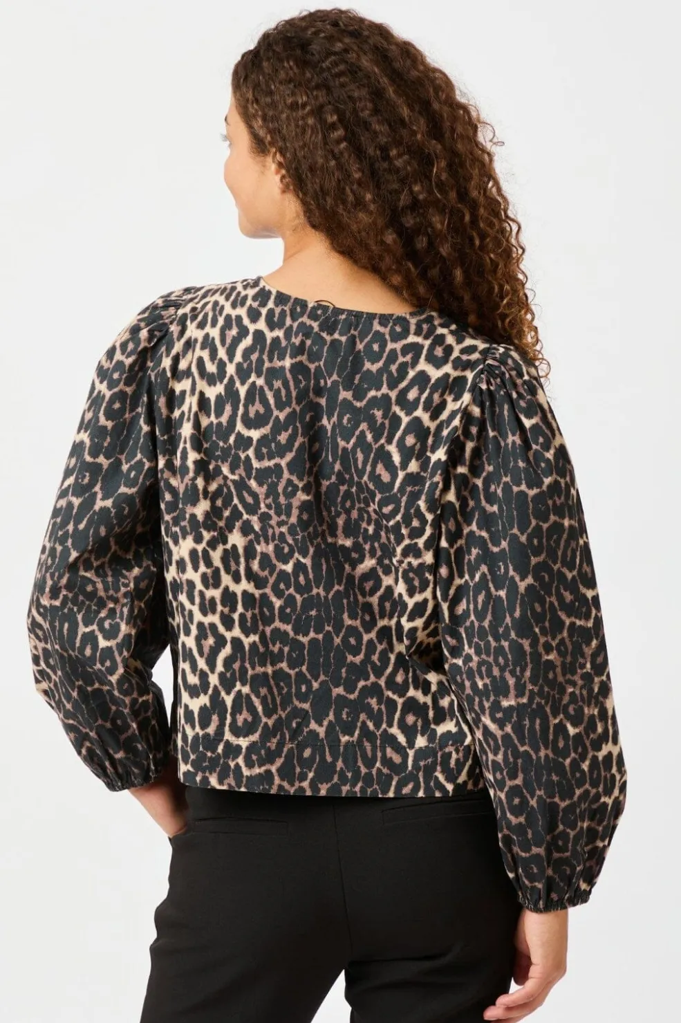 Bluse fra Neo Noir i leopardprint med sløjfedetaljer. Den har en dyb V-hals og puffede ærmer. Sløjferne foran skaber en fin detalje, der kan bindes efter ønske.
