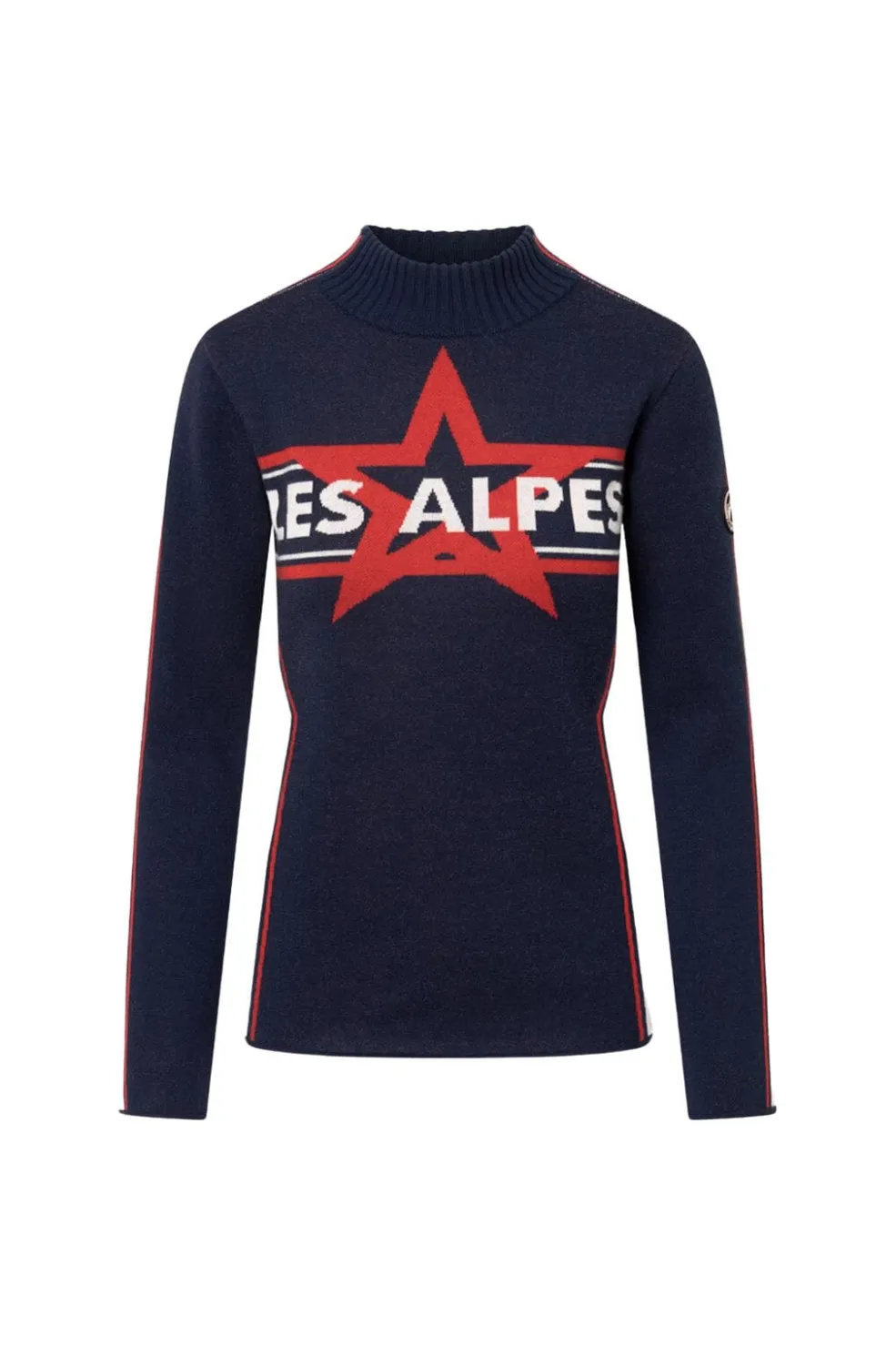 Striktrøje fra Twist & Tango i mørkeblå med rødt stjernedesign og LES ALPES-tekst på brystet. Striber i rød og hvid løber langs ærmerne.