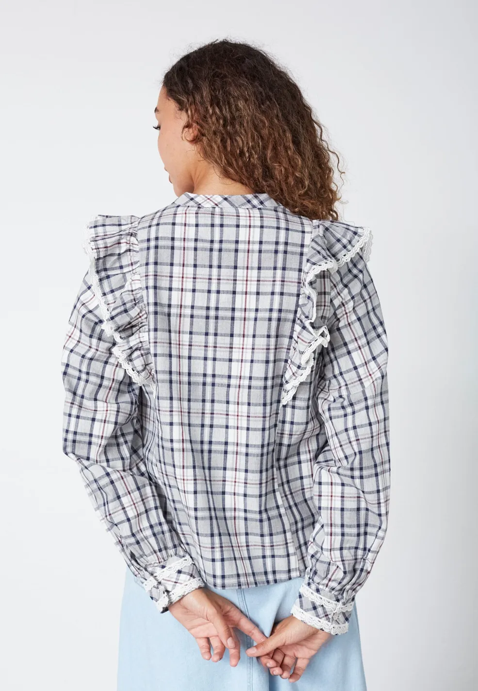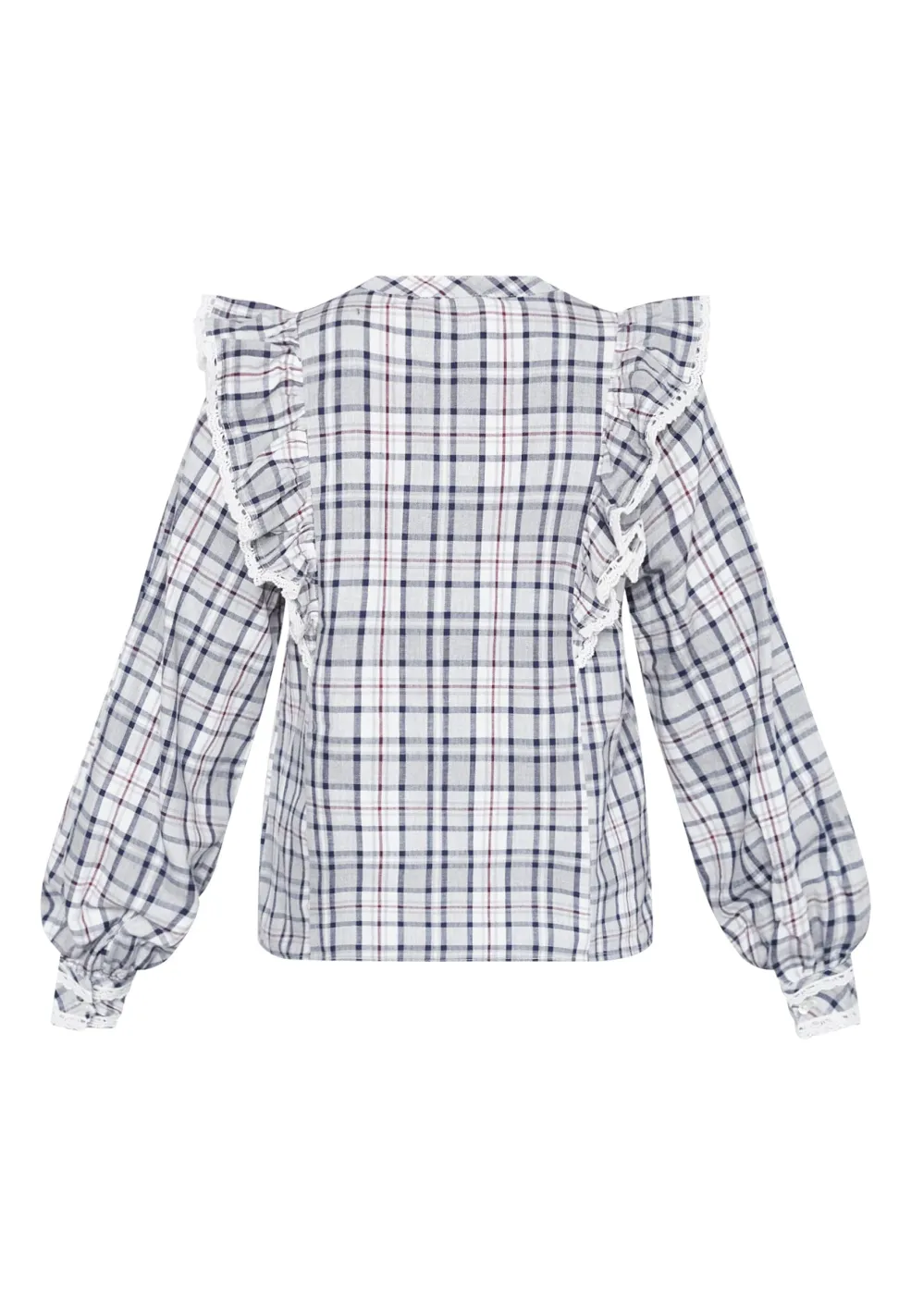 Ternet skjorte fra Sisters Point i grå nuancer med blå og hvide tern. Skjorten har en Peter Pan-krave og lange ærmer.