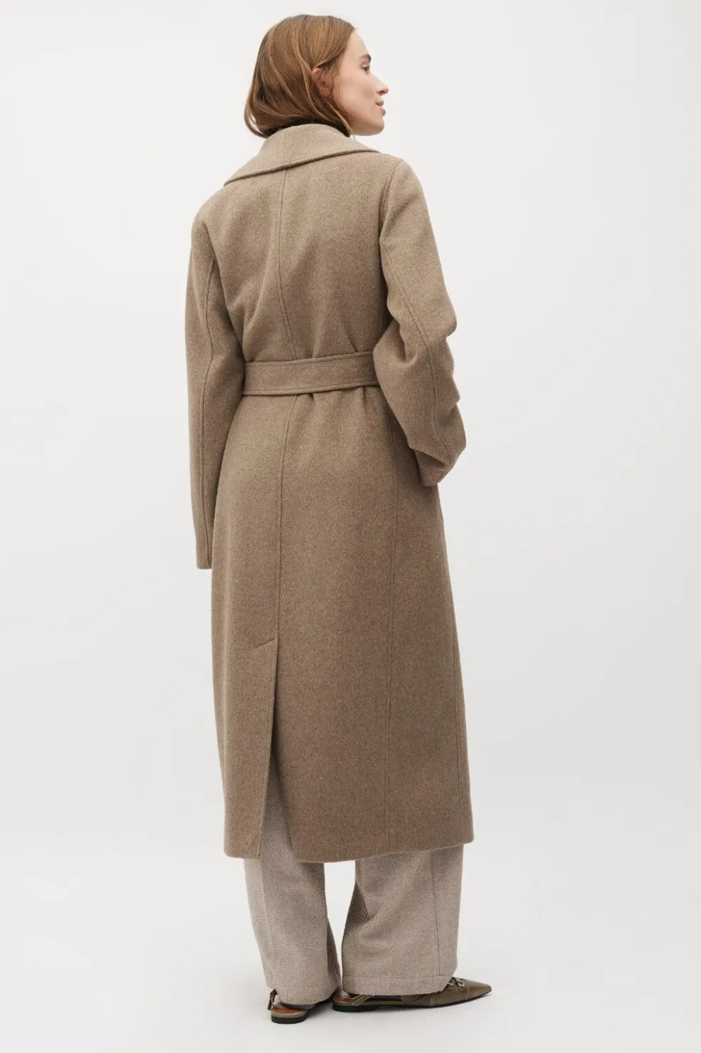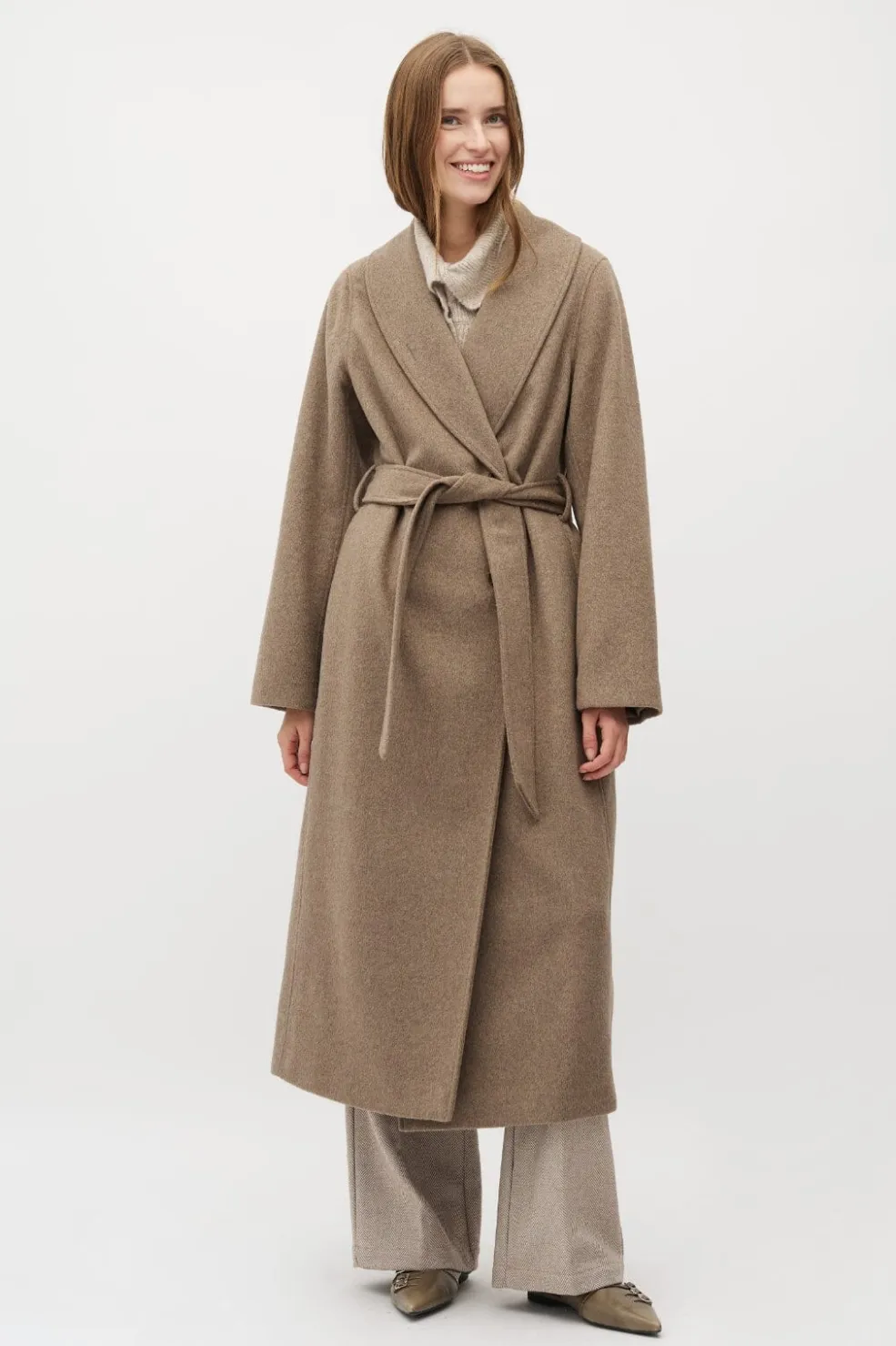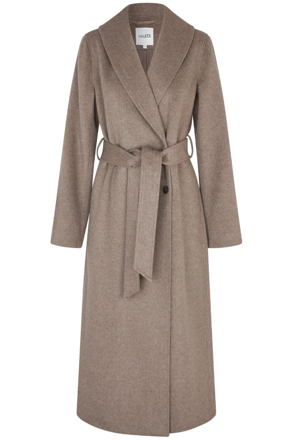Lang frakke fra MbyM i en gråbeige meleret farve. Frakken har et bindebælte i taljen og en bred krave.