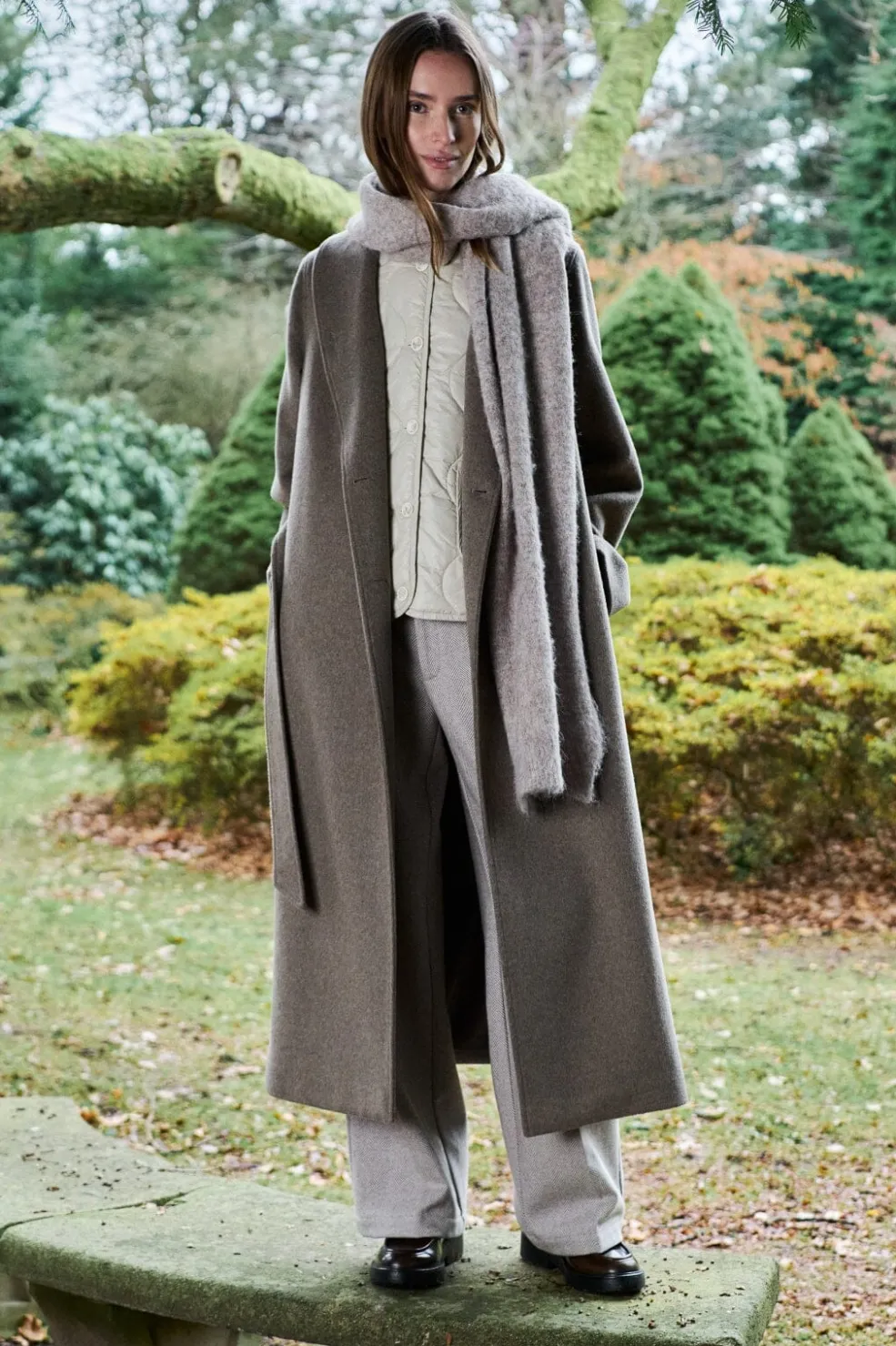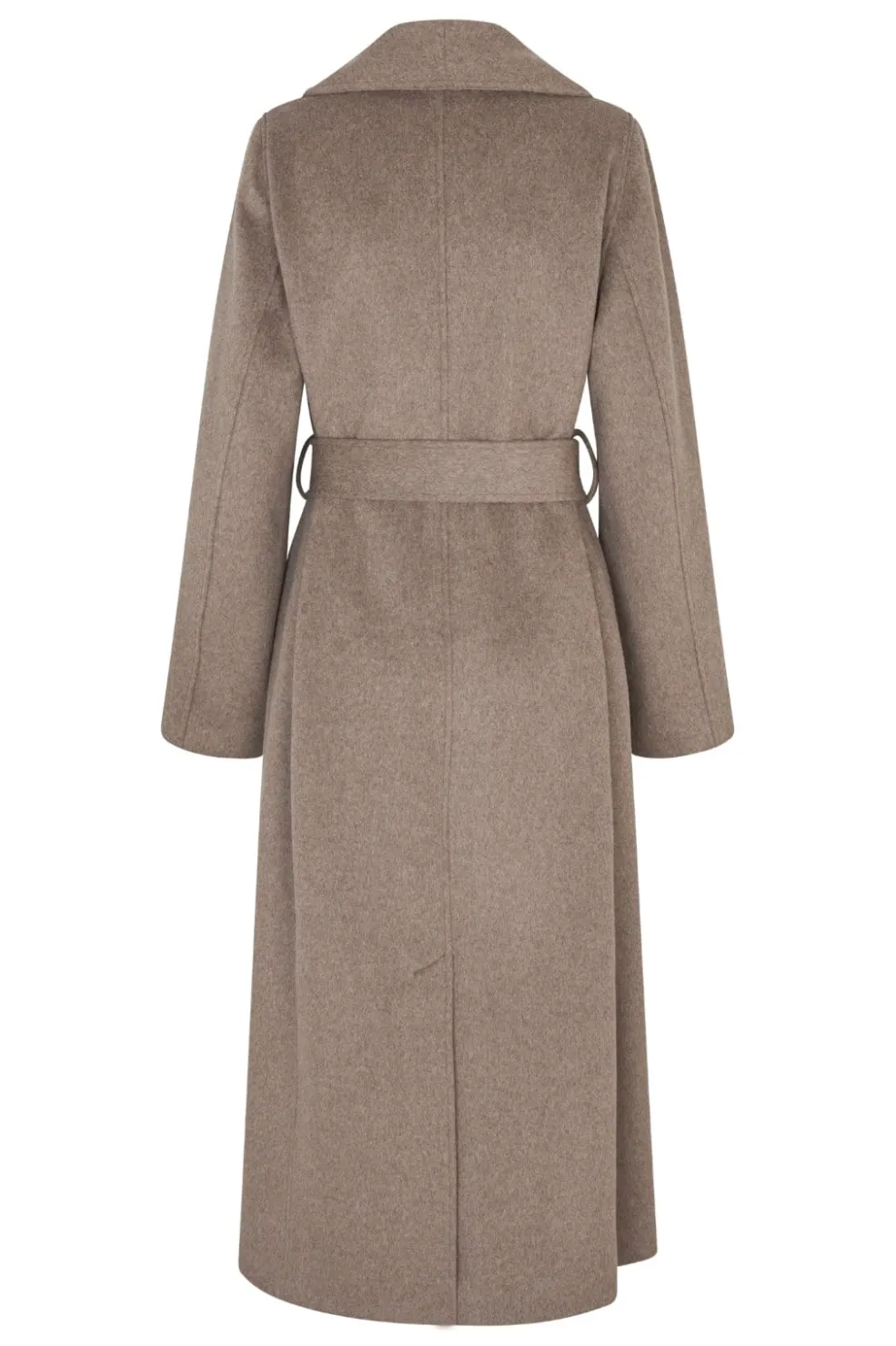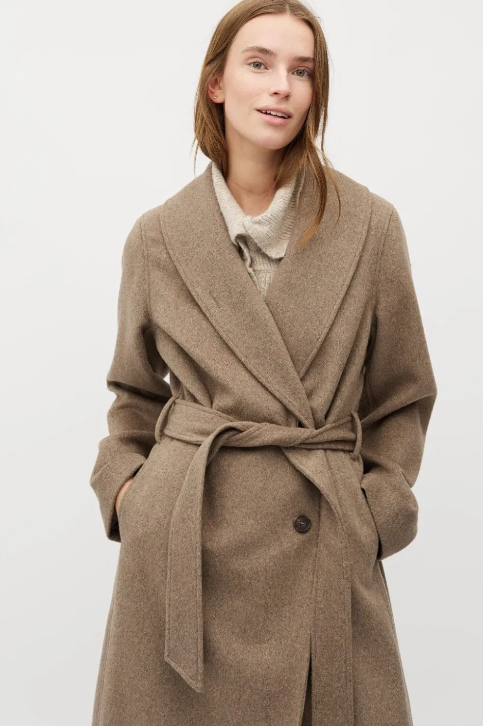 Lang frakke fra MbyM i en gråbeige meleret farve. Frakken har et bindebælte i taljen og en bred krave.