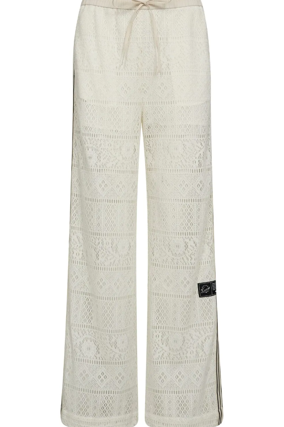 Bukser fra Haute L’Amitié i en off-white nuance. Bukserne har et blondemønster og bindebånd i taljen med kontraststriber langs sidesømmene.