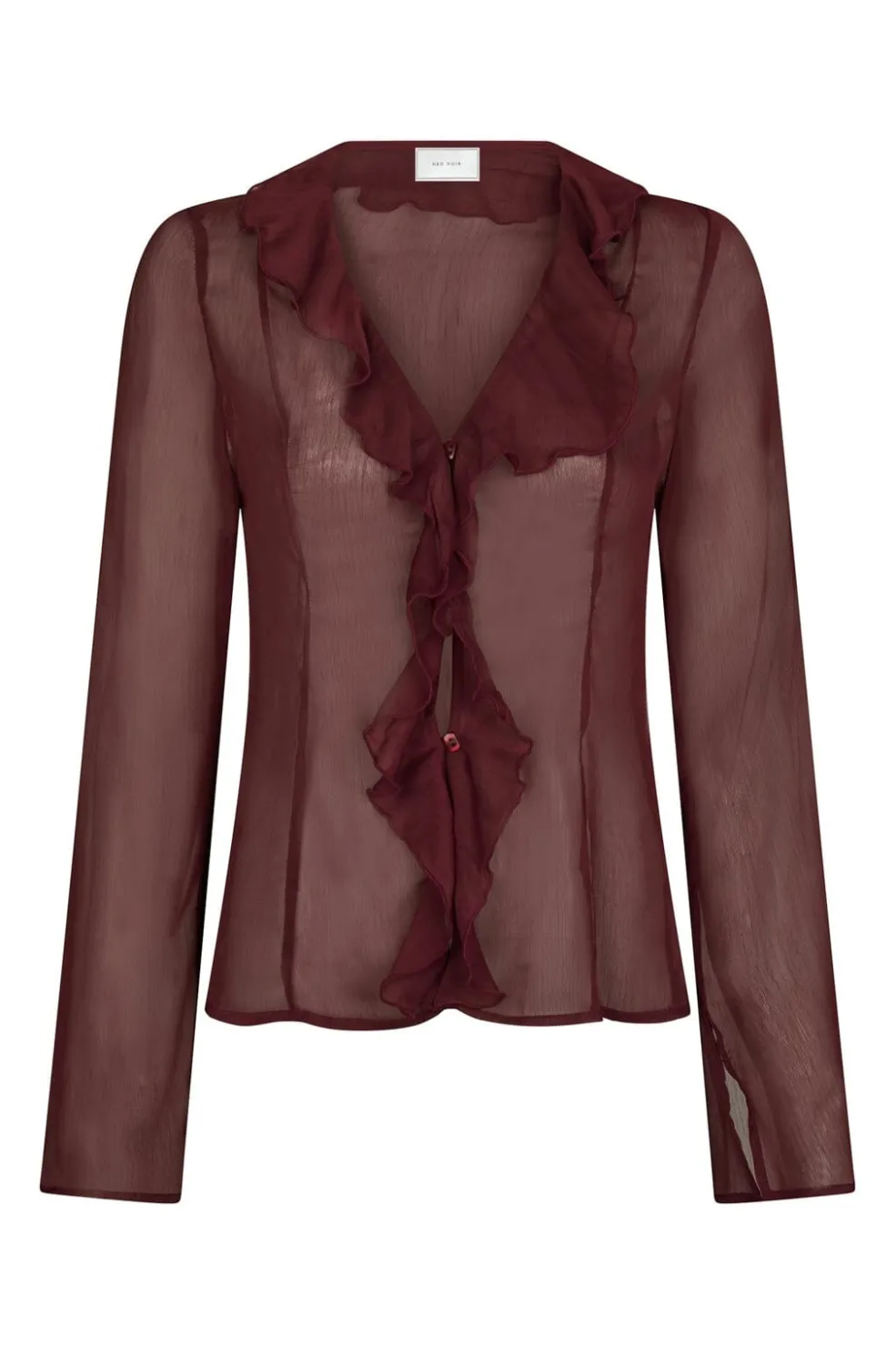 Vinrød chiffonbluse fra Neo Noir med gennemsigtigt stof. Blusen har flæsedetaljer langs V-udskæringen og ned langs fronten med knaplukning.