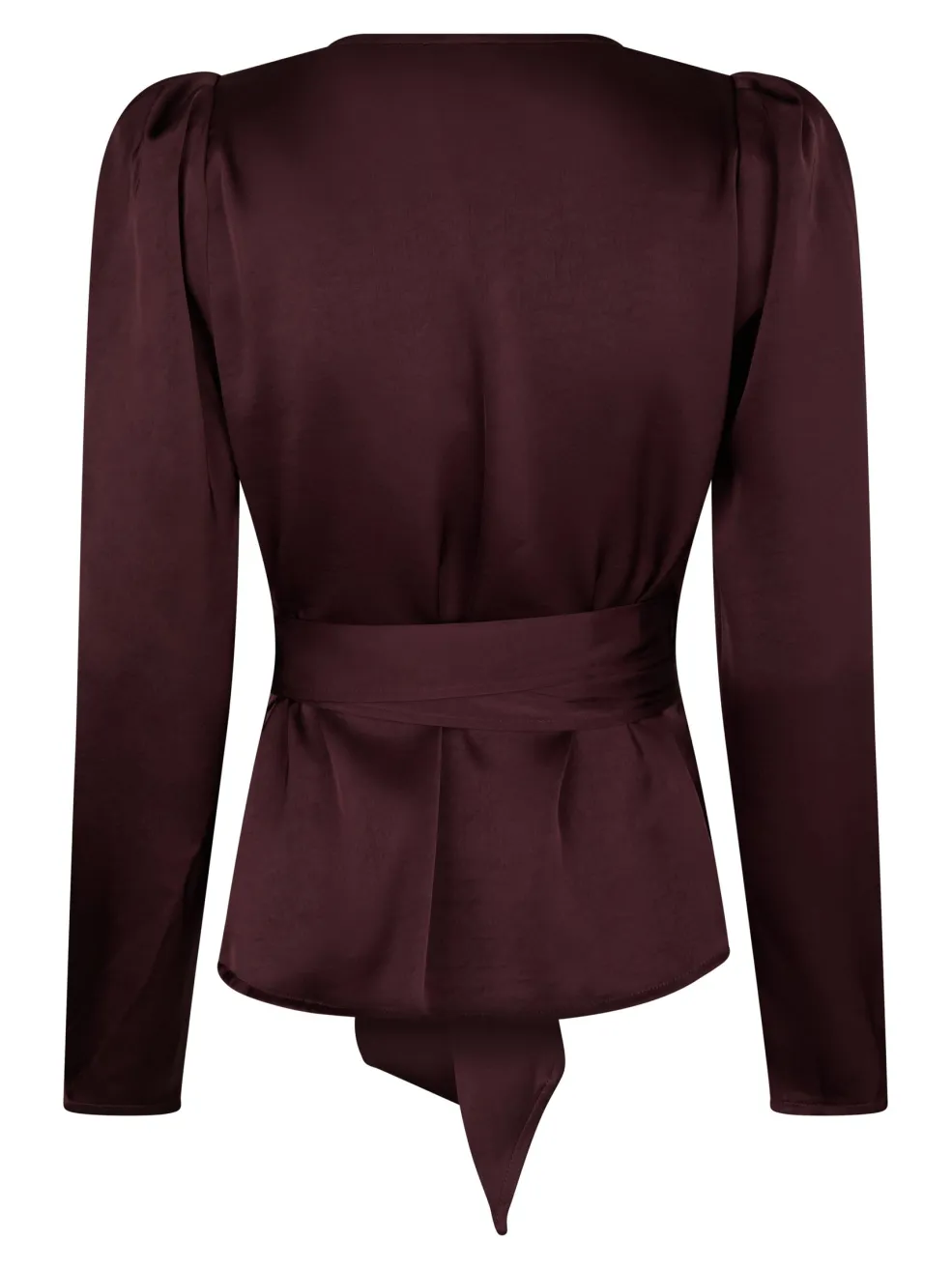 Satinbluse fra Valentin Studio i en dyb bordeauxfarve. Blusen har en wrap-stil med V-hals og bindebånd i taljen. De lange ærmer og det tunge satinstof giver blusen et rent udtryk.