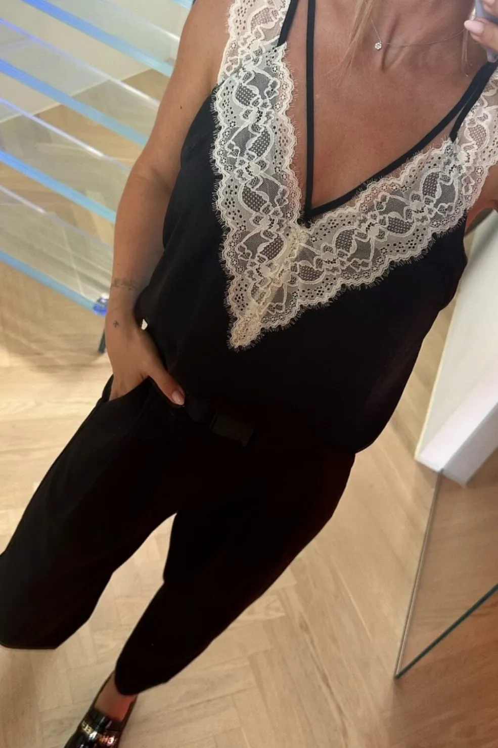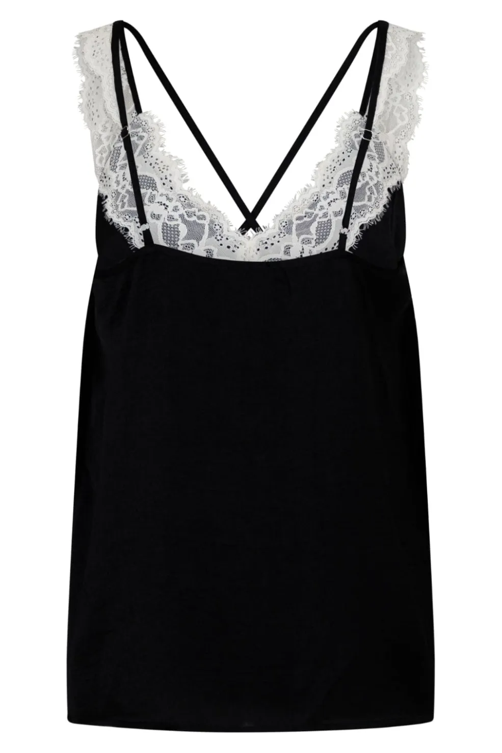Sort top fra Valentin Studio med hvid blondekant langs V-udskæringen. De tynde stropper og blondedetaljerne giver toppen et feminint udtryk, der passer til både formelle og festlige anledninger.
