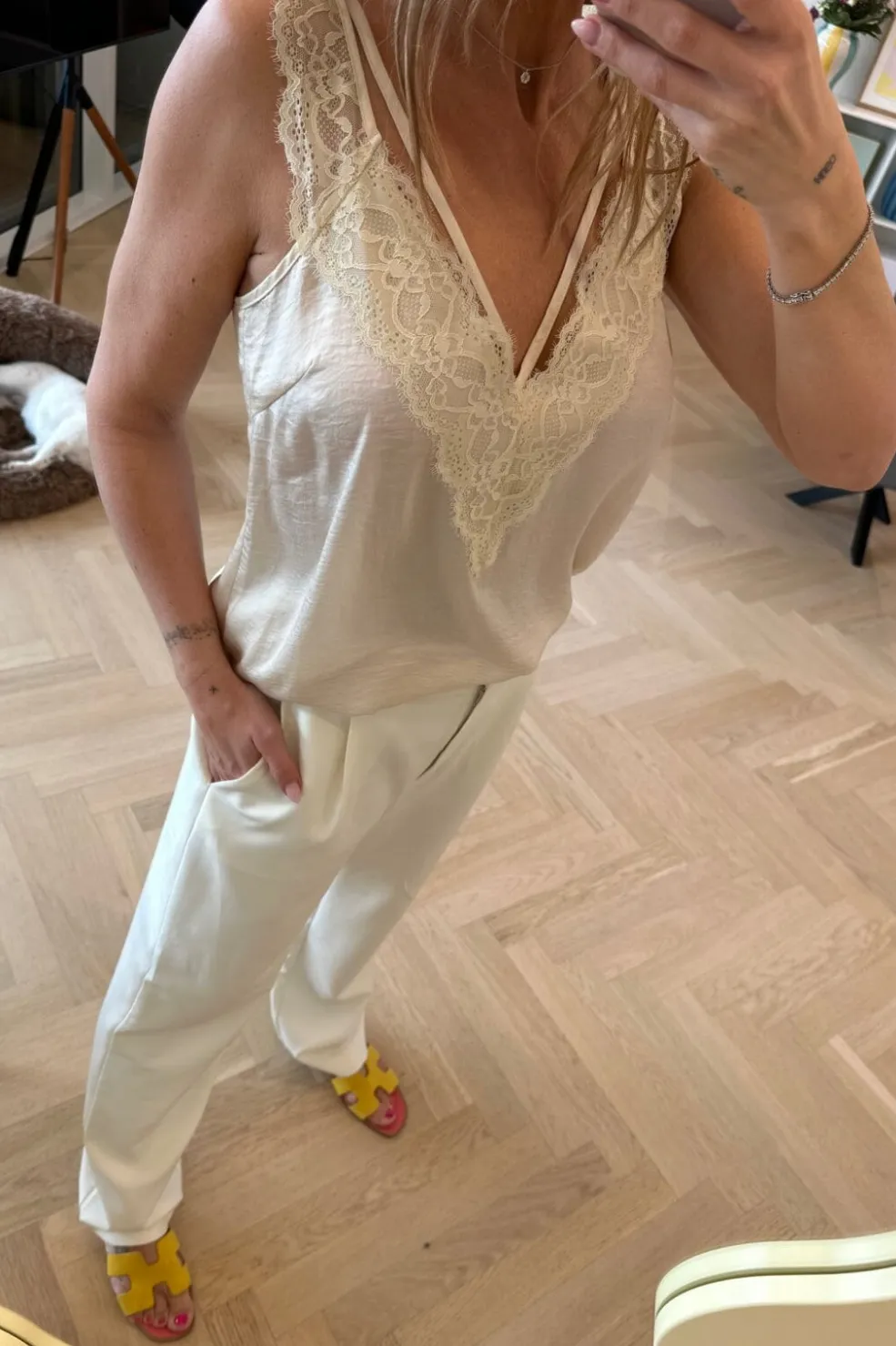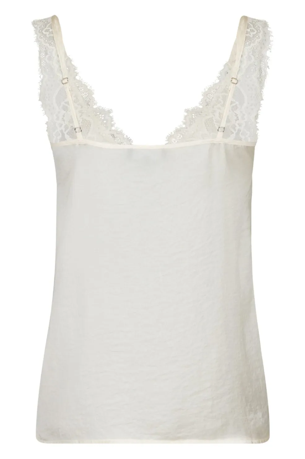 Cremefarvet top fra Valentin Studio med V-udskæring og blondekant. Toppen har tynde stropper og en normal pasform, der gør den brugbar til både hverdag og fest.