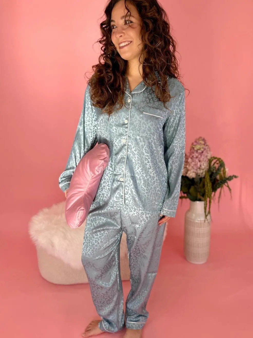 Lyseblå pyjamas fra A-bee med leopardmønster. Sættet har en slim fit-pasform og går til midt på læggen. Skjortekraven og knapperne giver et klassisk udtryk.