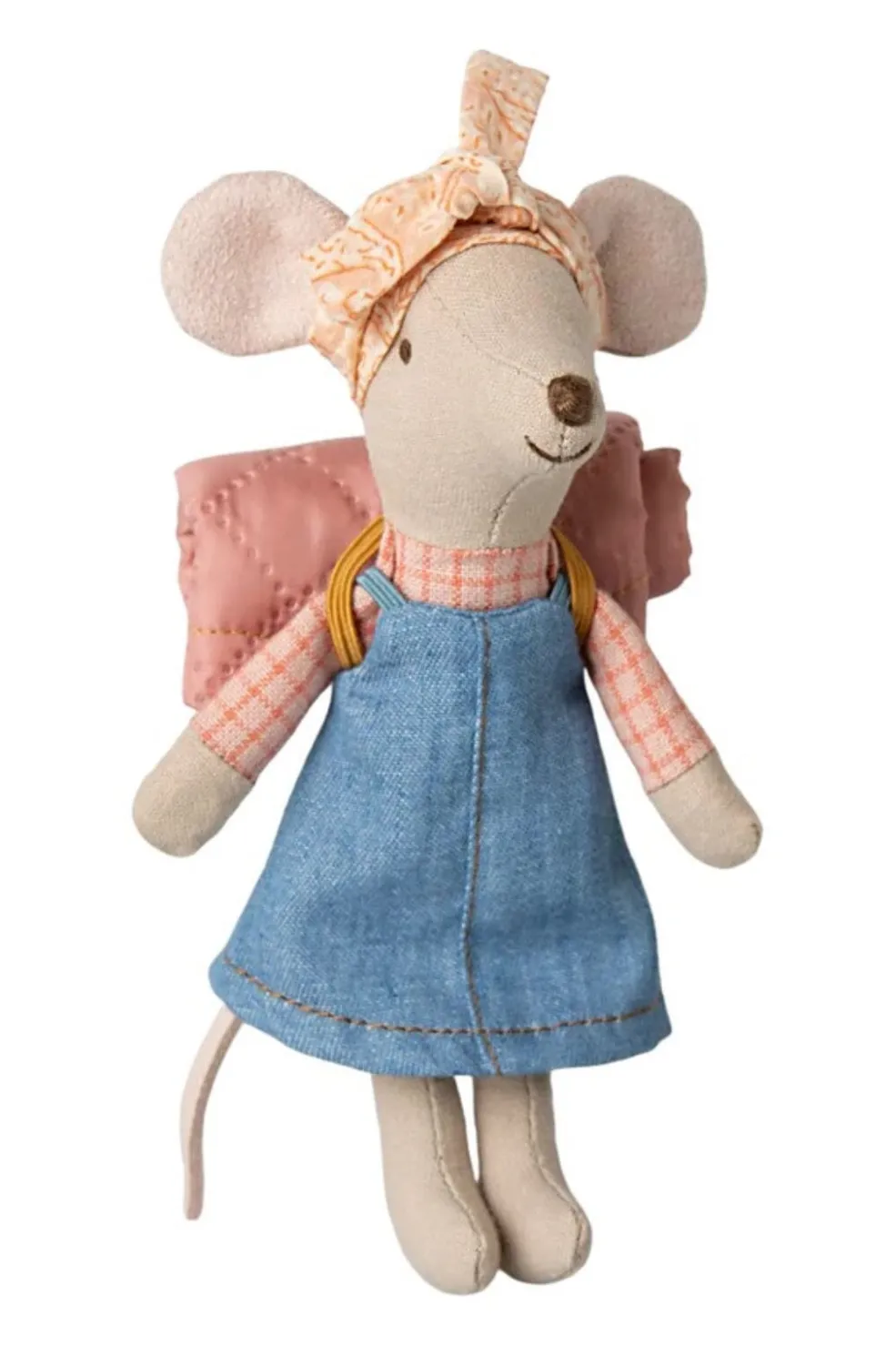 En musedukke fra Maileg med en blå kjole og en tilhørende sovepose. Musen har magneter i hænderne, der gør det muligt at placere den i forskellige stillinger under leg.