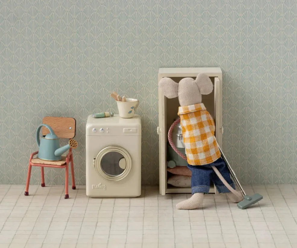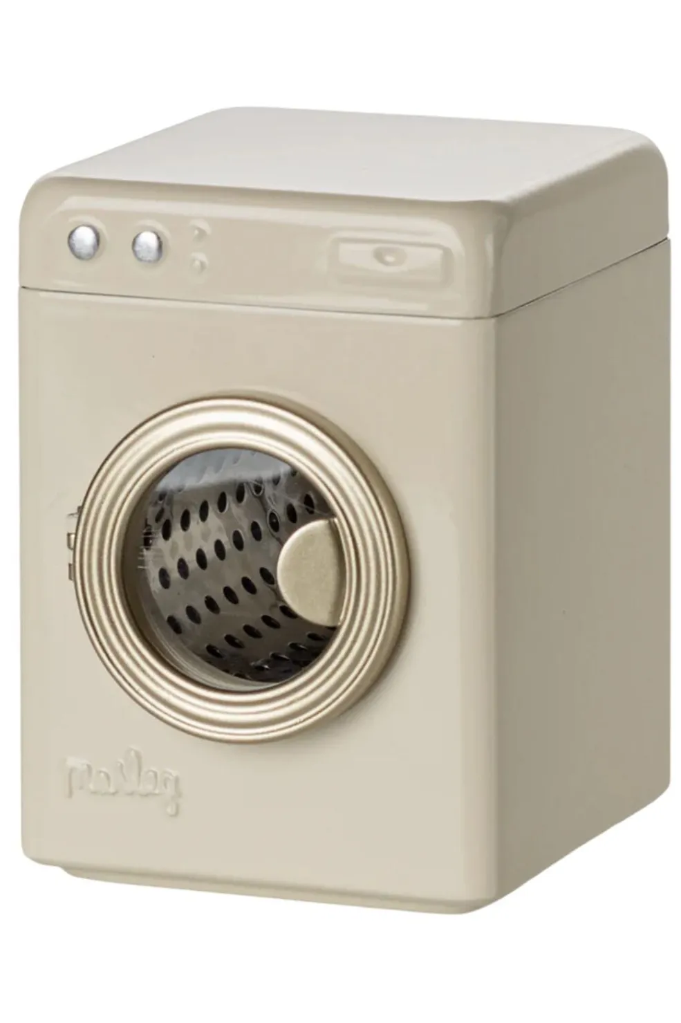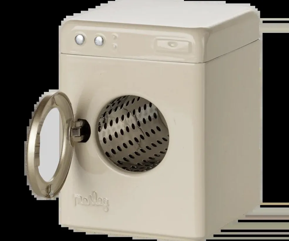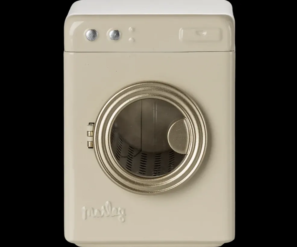 En miniaturevaskemaskine fra Maileg til musefamilien, lavet af metal og malet i en råhvid farve med detaljerede funktioner.