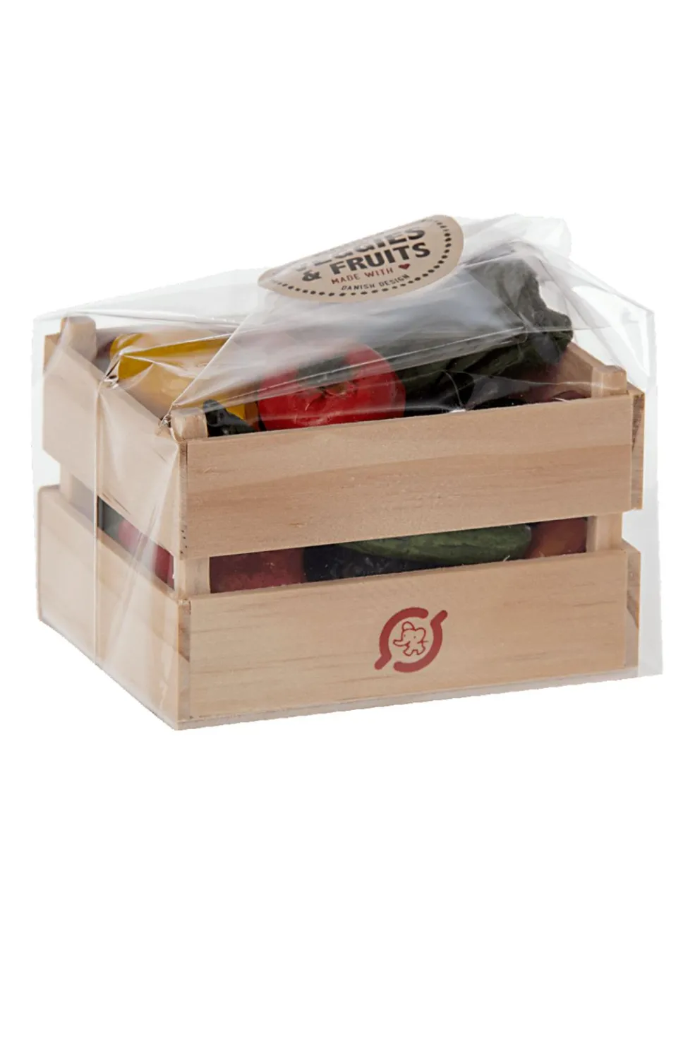 Legetøjsgrøntsager og -frugter fra Maileg i en trækasse. De naturtro grøntsager og frugter er lavet af holdbare materialer og har realistiske detaljer.