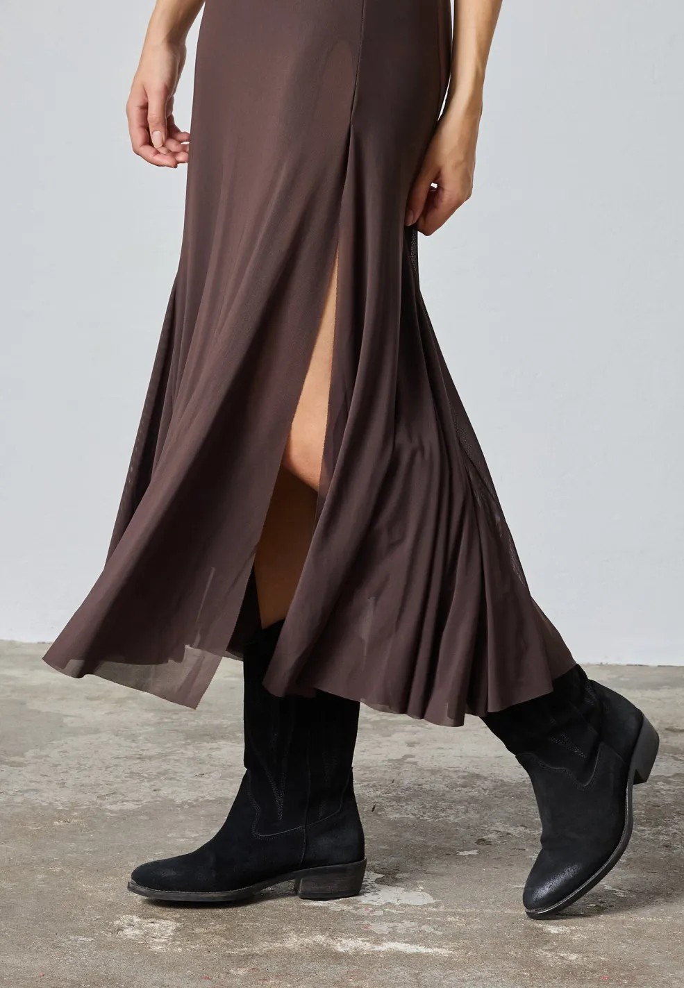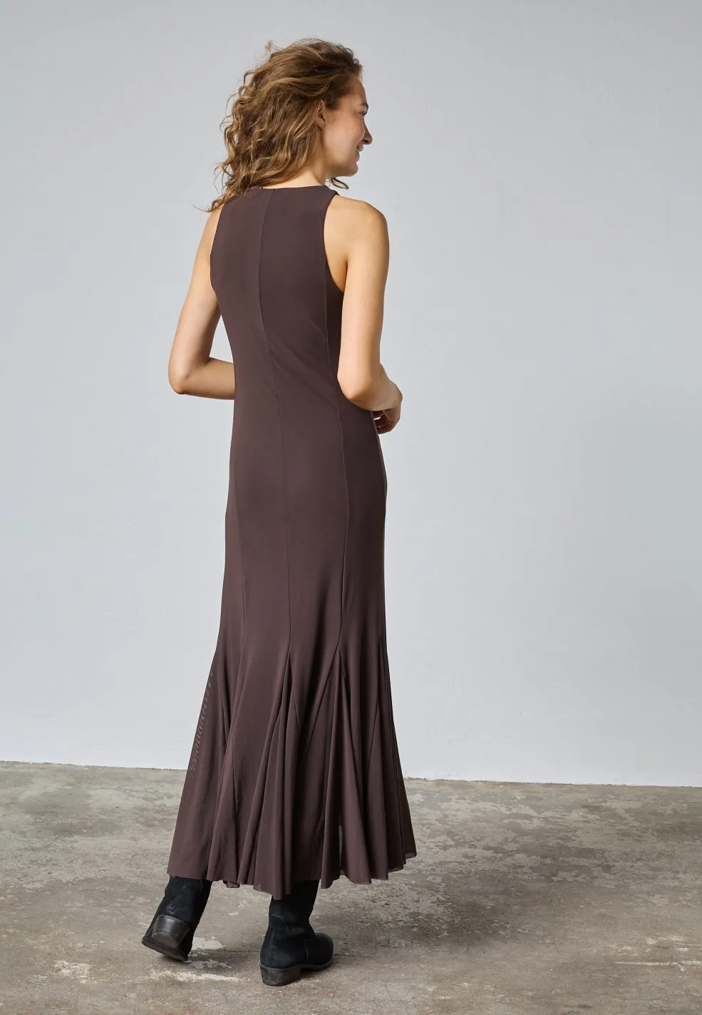 Lang brun kjole fra Sisters Point uden ærmer. Kjolen har en høj halsudskæring og en løs pasform forneden med slids i siden.