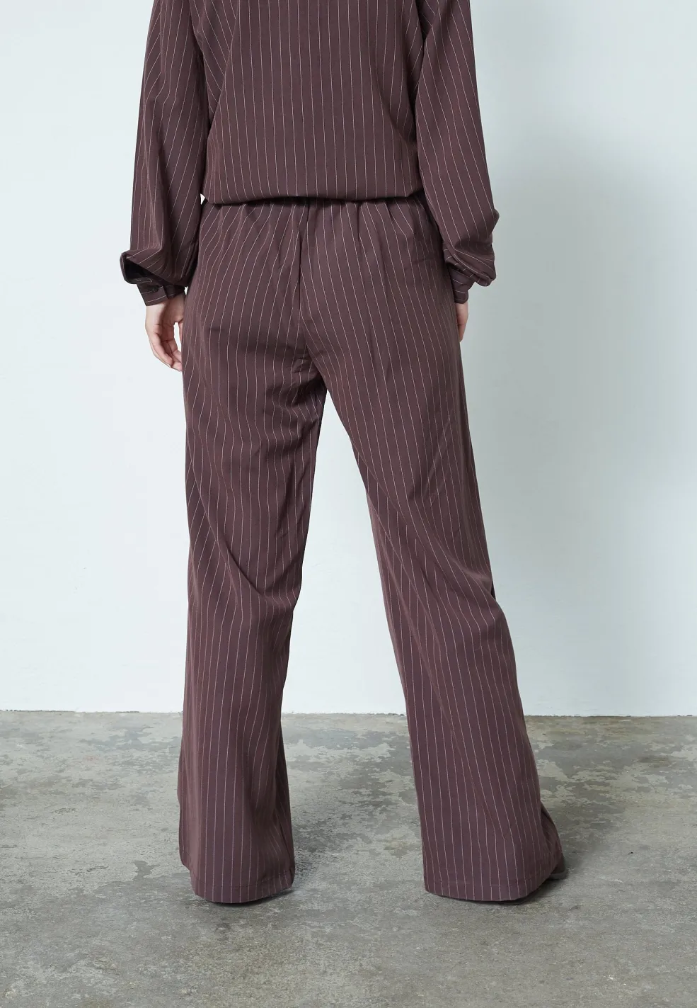Gulvlange bukser fra Sisters Point med lodret stribemønster i brun og creme. Bukserne har en løs pasform og høj talje.