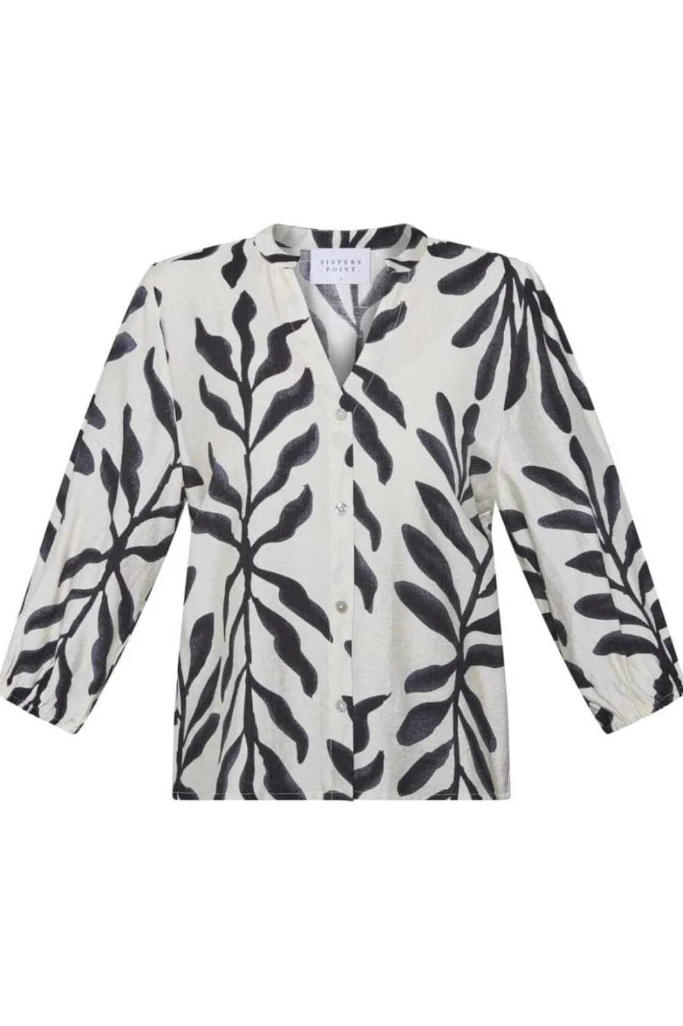 Skjorte fra Sisters Point med sort bladmønster på cremefarvet baggrund. Skjorten har v-hals, trekvartlange ærmer og knaplukning foran. Den løse pasform giver god bevægelsesfrihed.