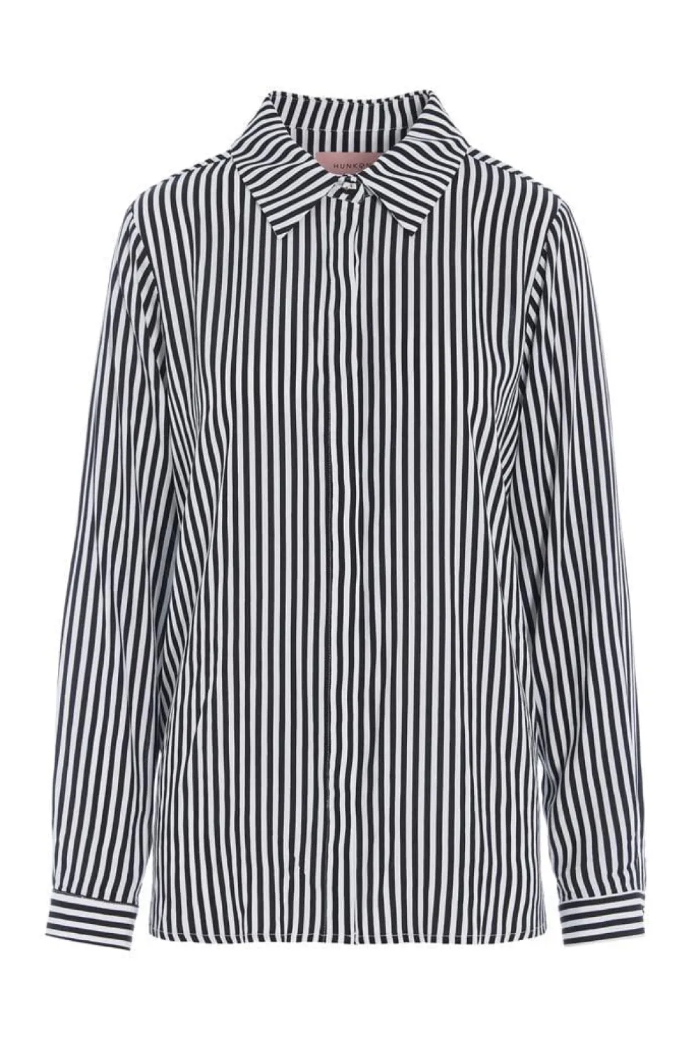 Sortstribet skjorte fra Hunkøn med lodrette sorte og hvide striber. Skjorten har en klassisk krave og knaplukning.