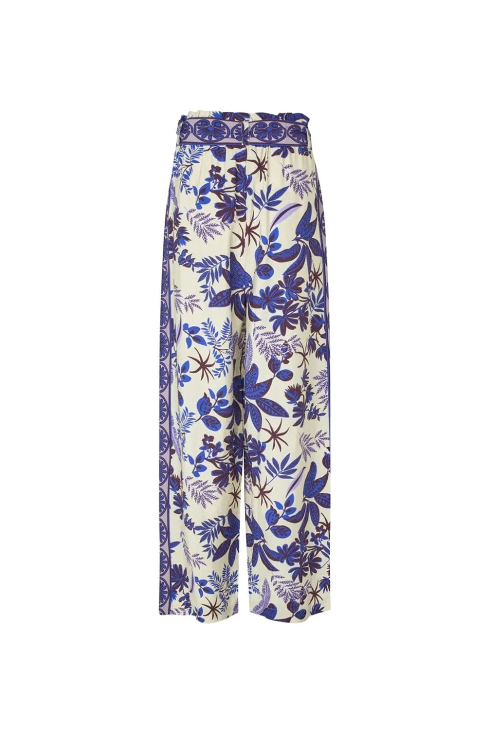 Bukser fra Lollys Laundry med blå og lilla blomsterprint på lys bund. De har en løs pasform og høj talje med bindebånd.