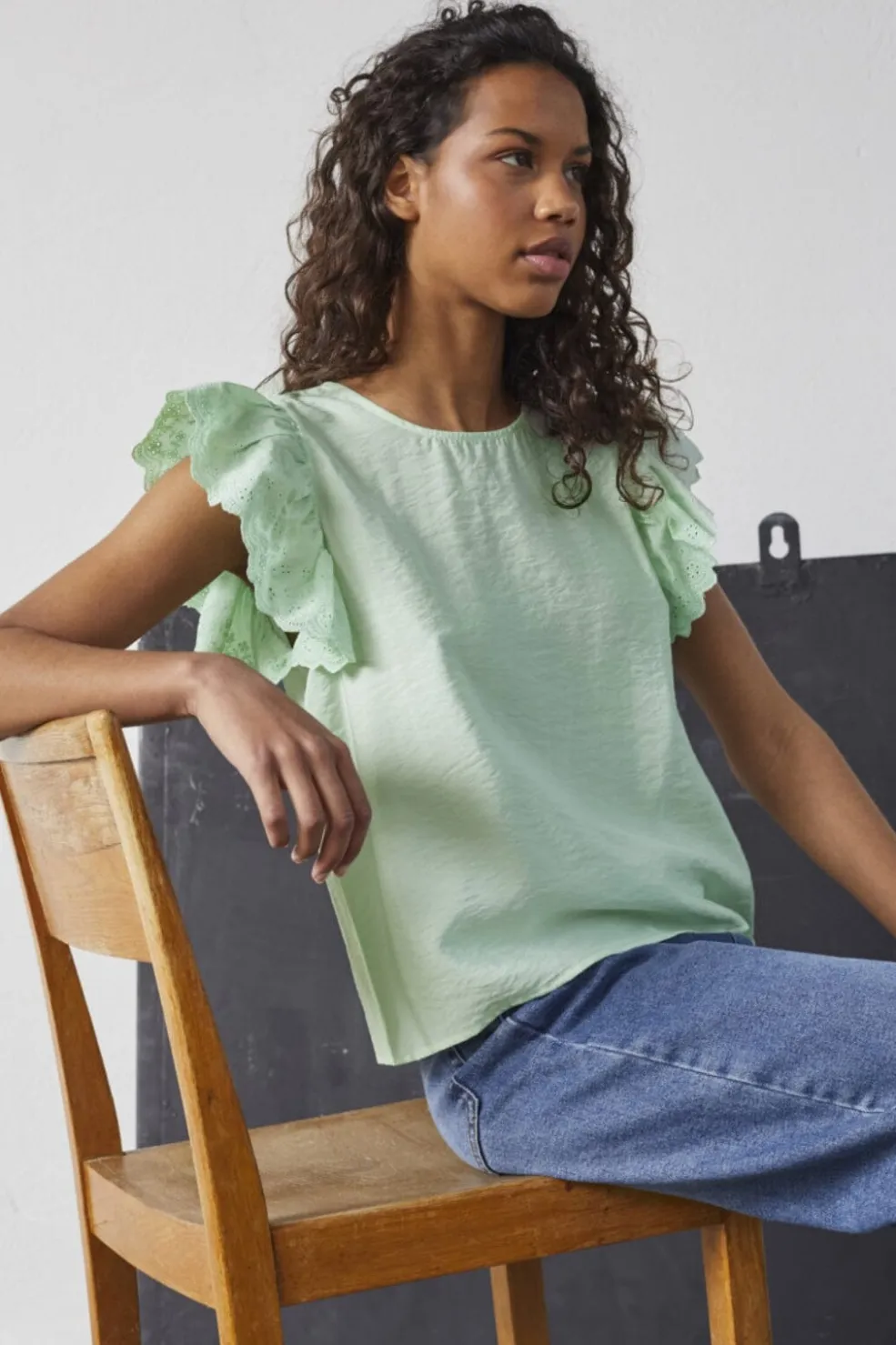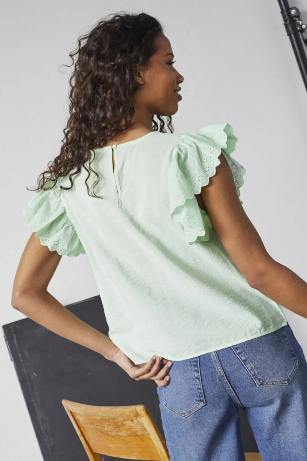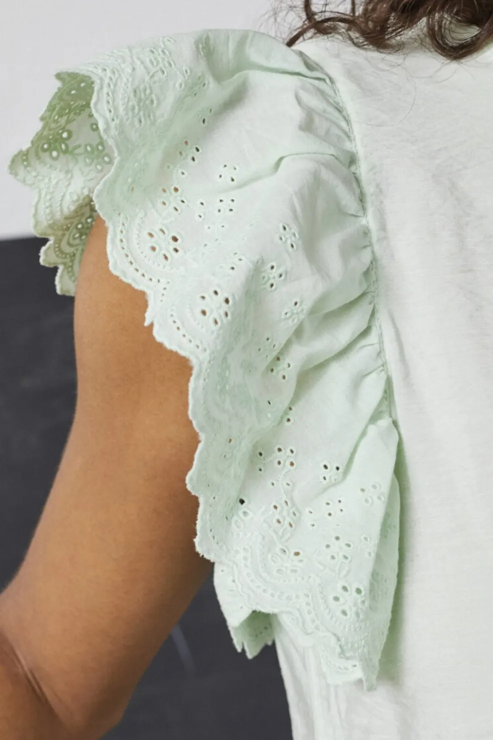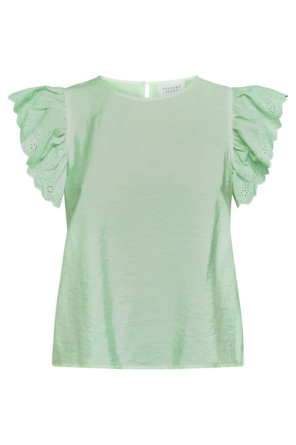Mintgrøn top fra Sisters Point med flæser og broderi anglaise på ærmerne. Den runde hals og de korte ærmer giver en enkel grundform, mens flæserne tilføjer et fint detaljeniveau.