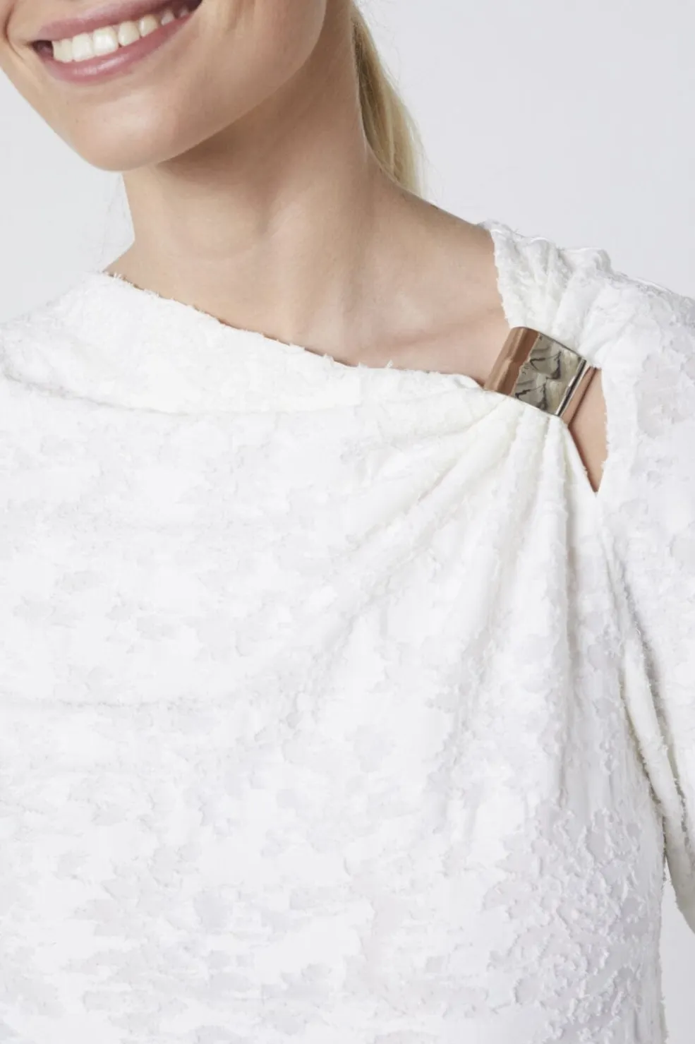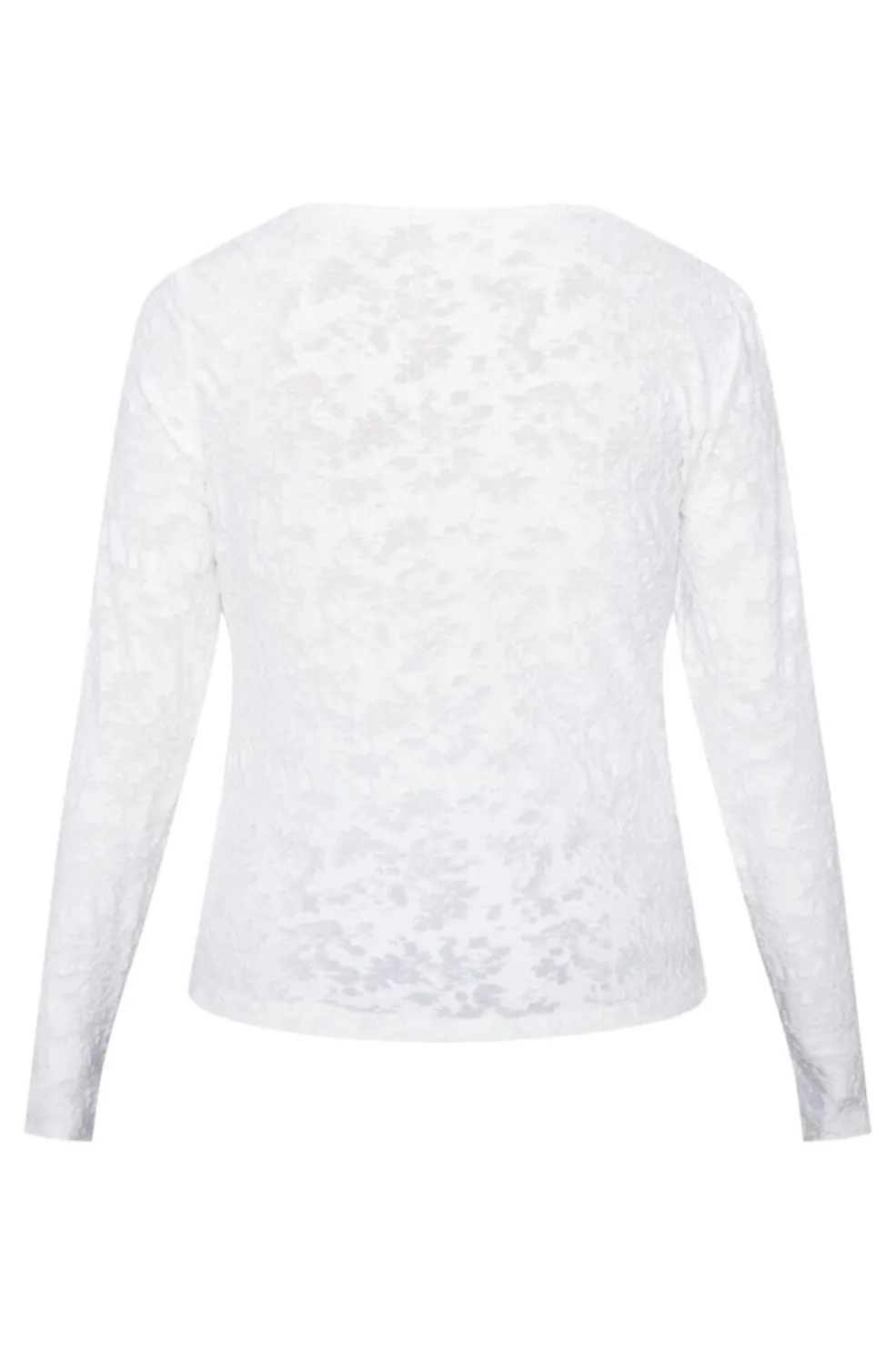 Cremehvid bluse fra Sisters Point med et floralt burnout-mønster. Blusen har lange ærmer og en slim fit-pasform. Et dekorativt metalspænde pryder den runde hals.