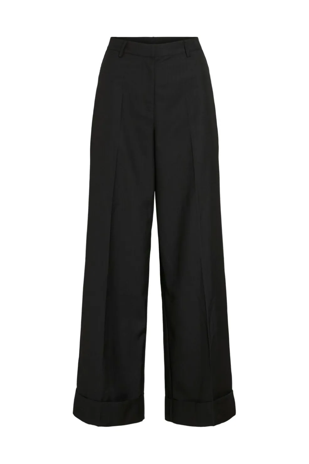 Sorte bukser fra Vila med høj talje og løs pasform. Bukserne har brede ben med oprullede manchetter og bæltestropper i taljen. De er udstyret med sidelommer samt praktisk lynlås- og knaplukning.