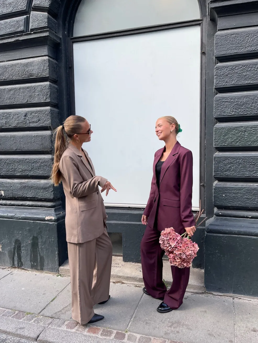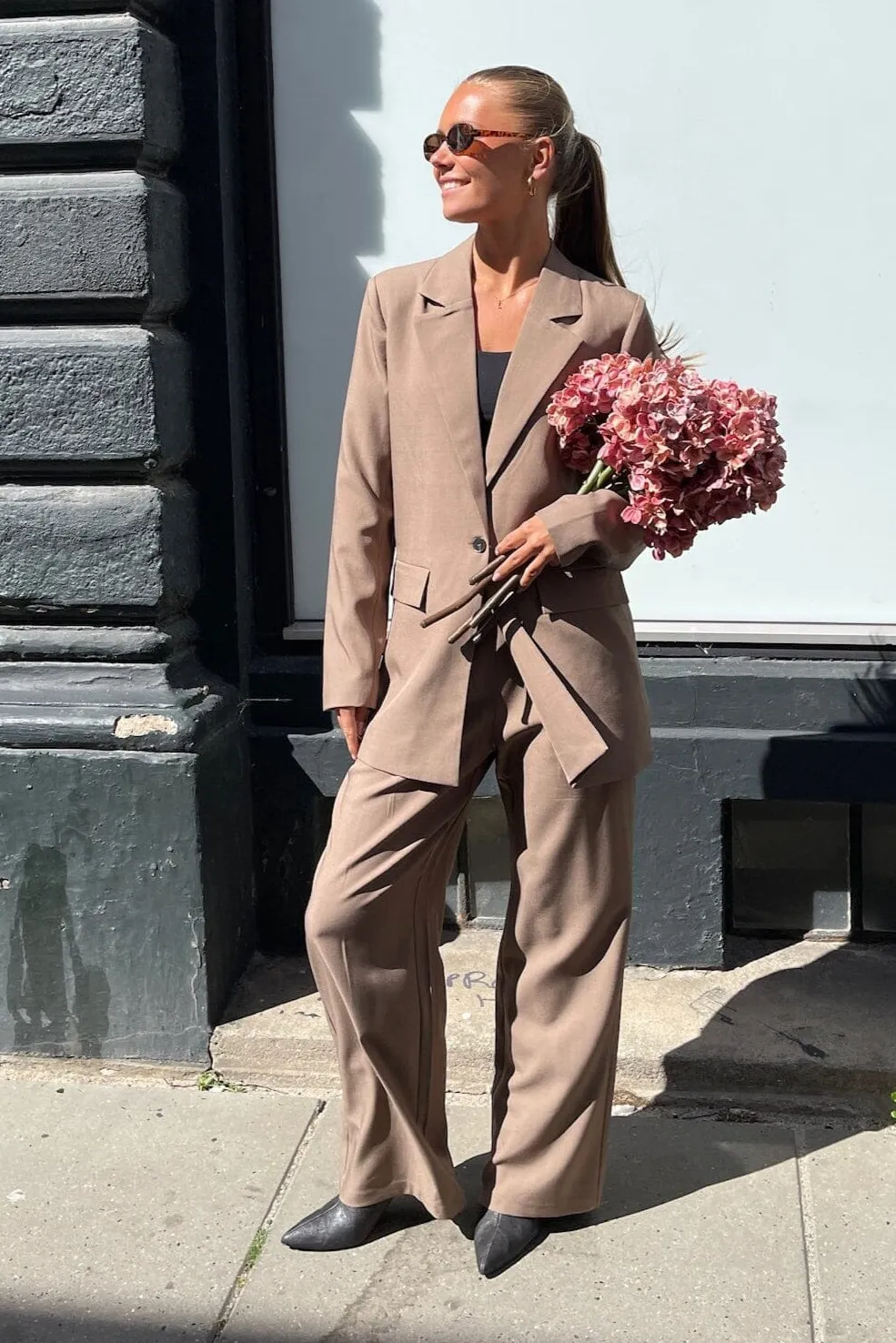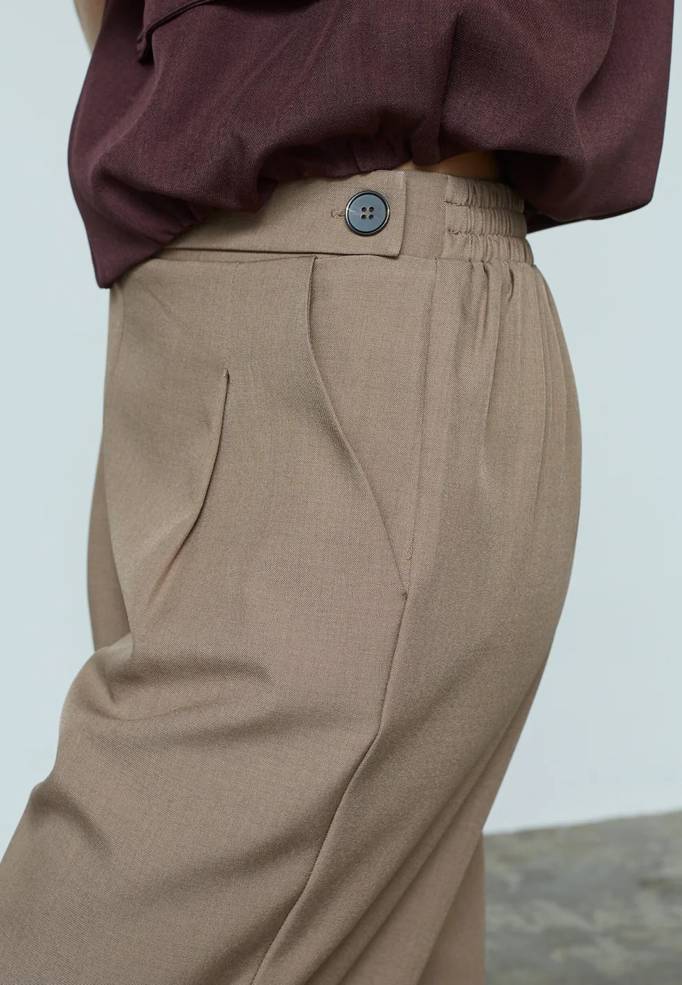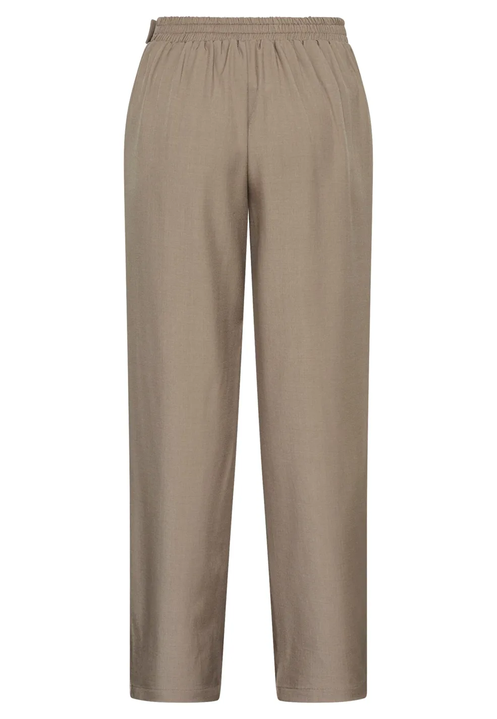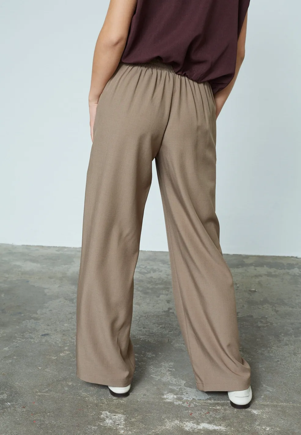 Bukser fra Sisters Point i en sandfarvet melange-nuance. Bukserne har en høj talje, løs pasform og en gulvlang længde med pressefolder foran.