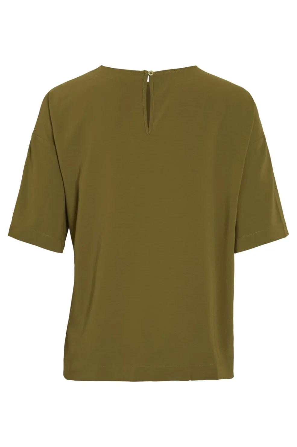 Mørkegrøn top fra Vila med rund halsudskæring. Toppen har en dekorativ knudedetalje med metalaccent og korte ærmer. Den er fremstillet af delvist genanvendt materiale.