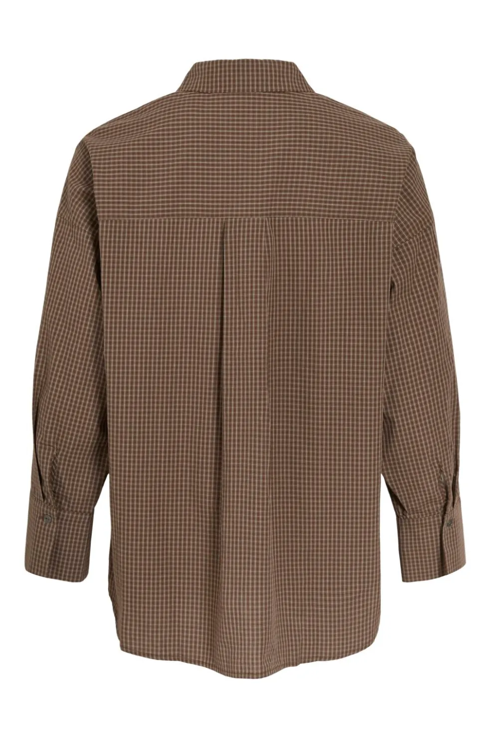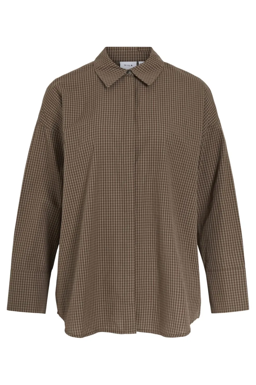 Brun skjorte fra Vila med småternet mønster. Skjorten har en klassisk krave, knapper hele vejen ned og en oversized pasform, der giver god bevægelsesfrihed.