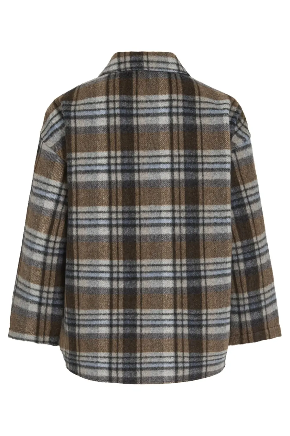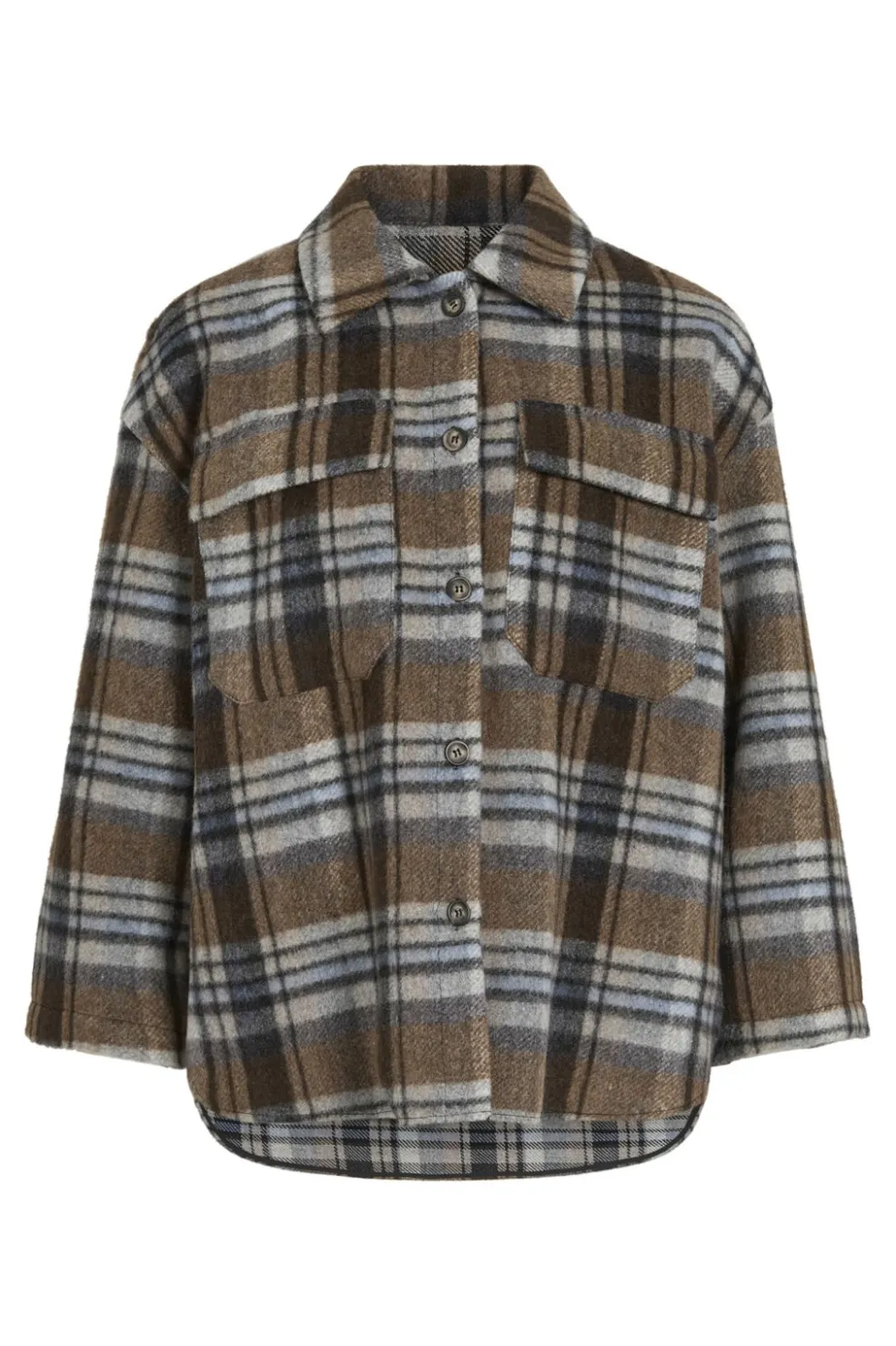 Ternet shacket fra Vila i brun og blå. Jakken har en oversized pasform med skjortekrave og 3/4 ærmer. To brystlommer med klapper og knapper ned langs forsiden.