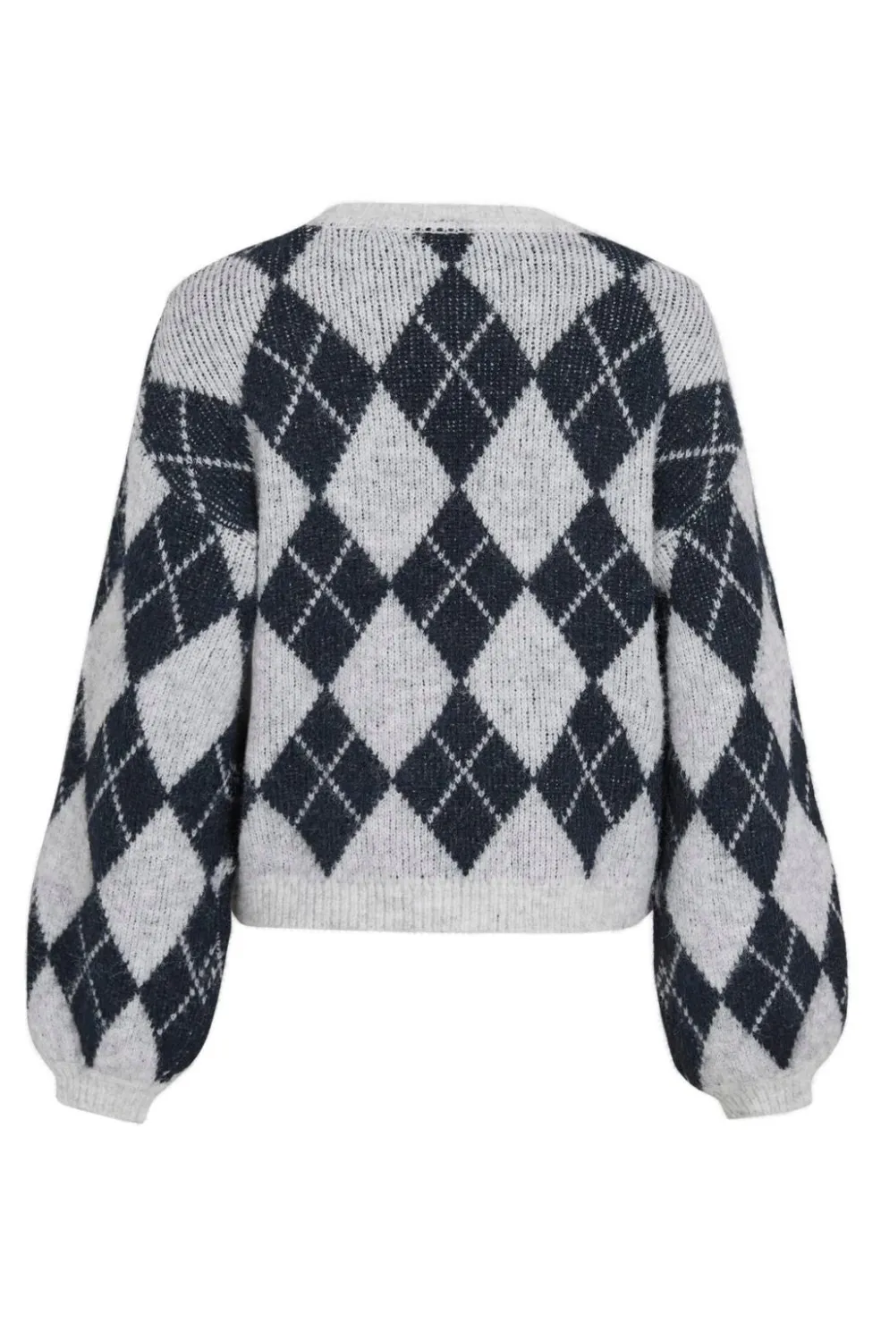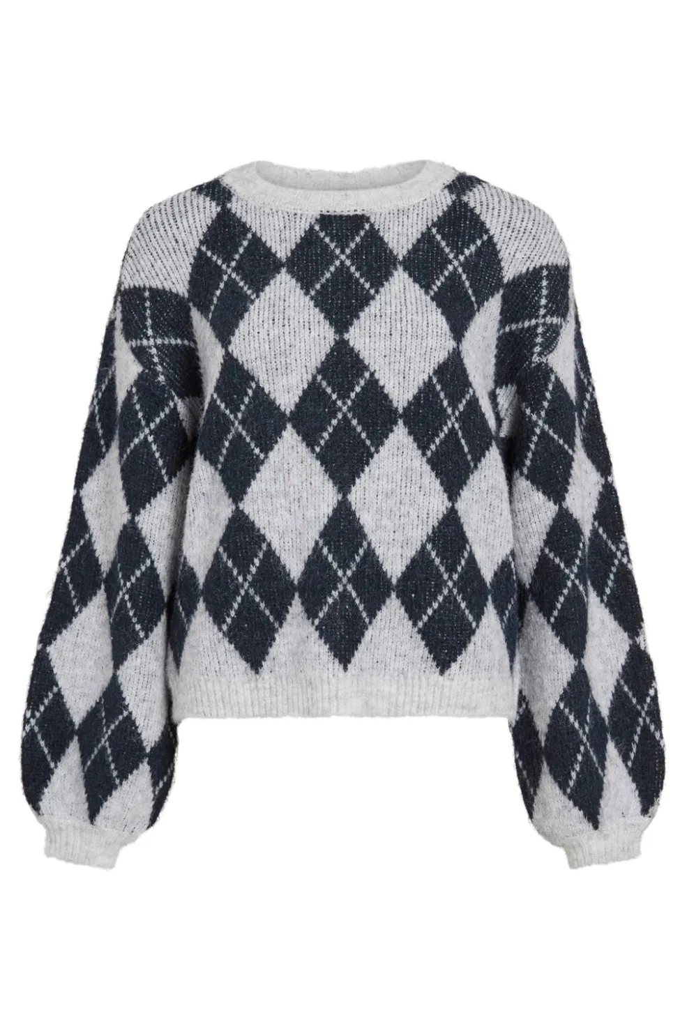 Strikket pullover fra Vila med harlekinmønster i lysegrå og mørkeblå. Pulloveren har lange ærmer og en rund halsudskæring.