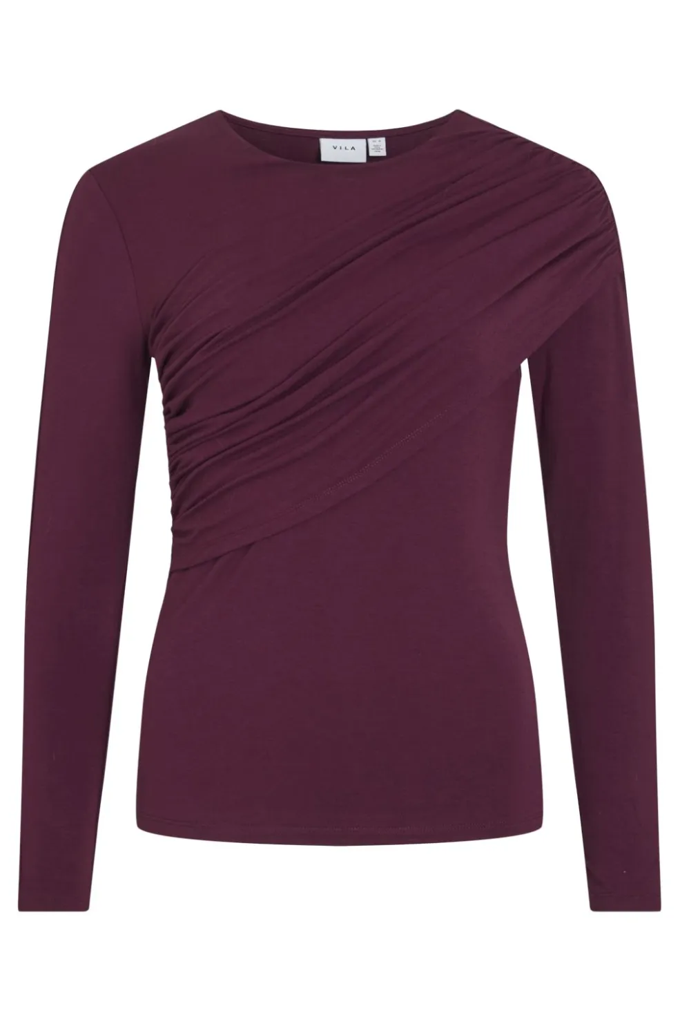 Bordeauxfarvet langærmet top fra Vila med rund halsudskæring. Toppen har draperede detaljer på fronten og en tætsiddende pasform.
