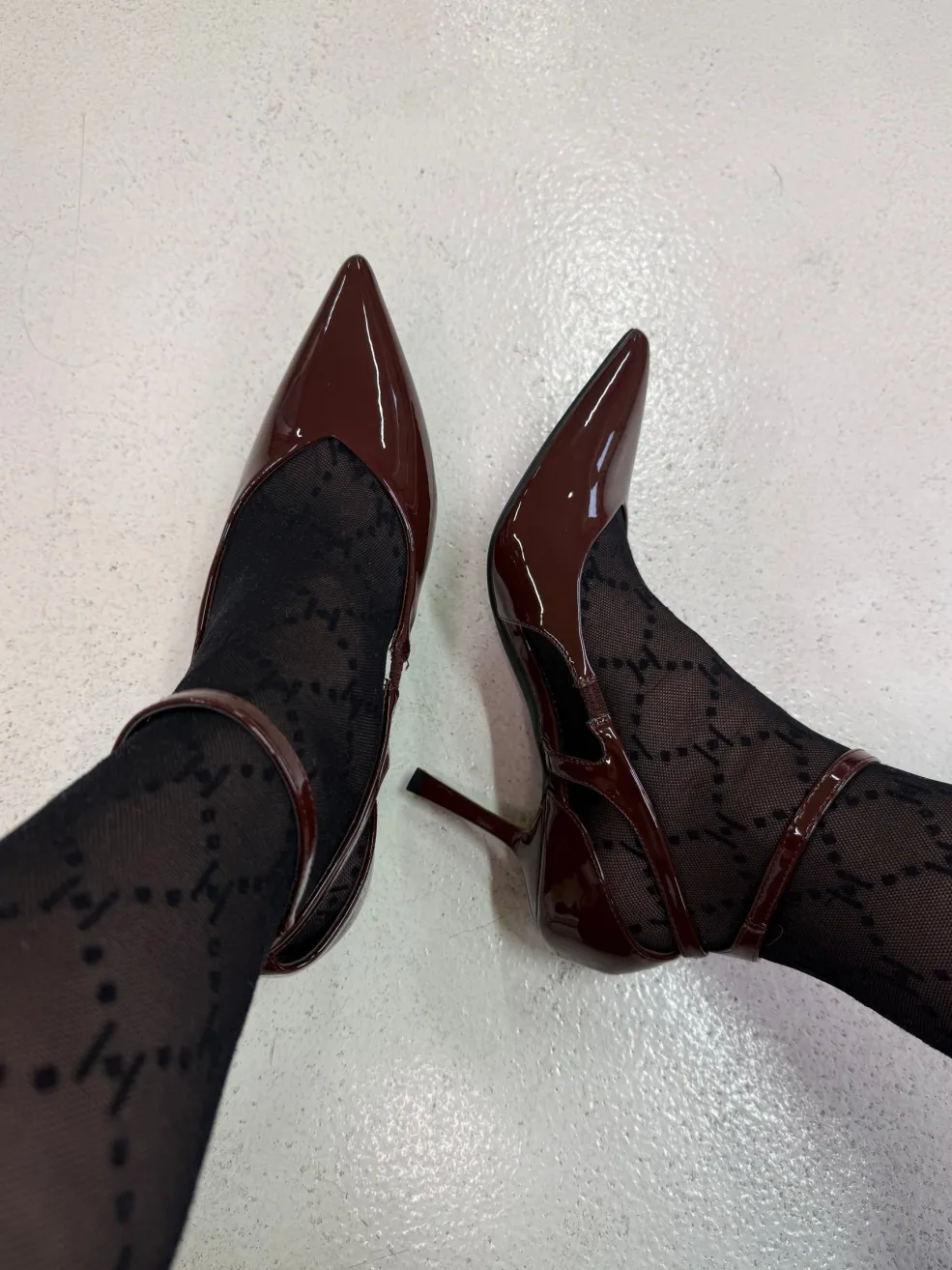 Stiletter fra Bloom i mørkebrun. Skoen har en stilettohælt og en firkantet tå, og den passer til formelle lejligheder og fester.