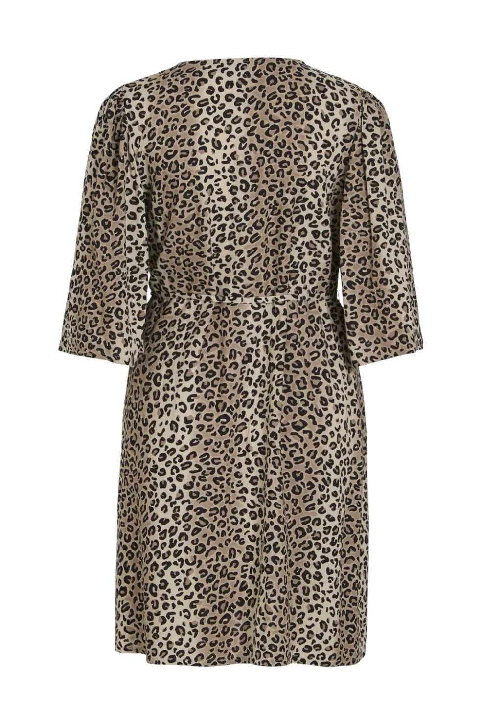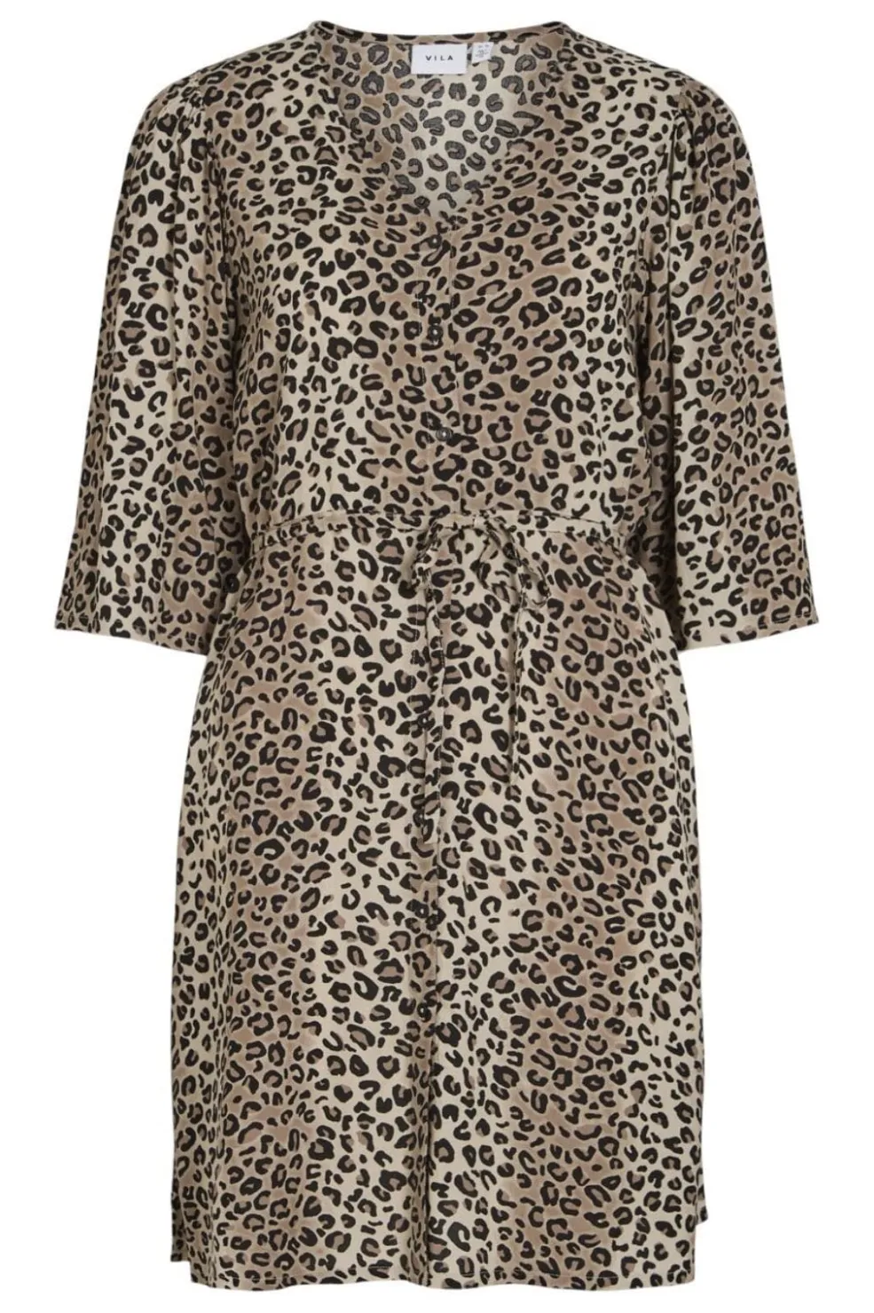 Beige kjole med leopardprint fra Vila. Kjolen har V-udskæring, 3/4 ærmer og knapdetaljer. Et bindebånd i taljen giver mulighed for at justere pasformen.