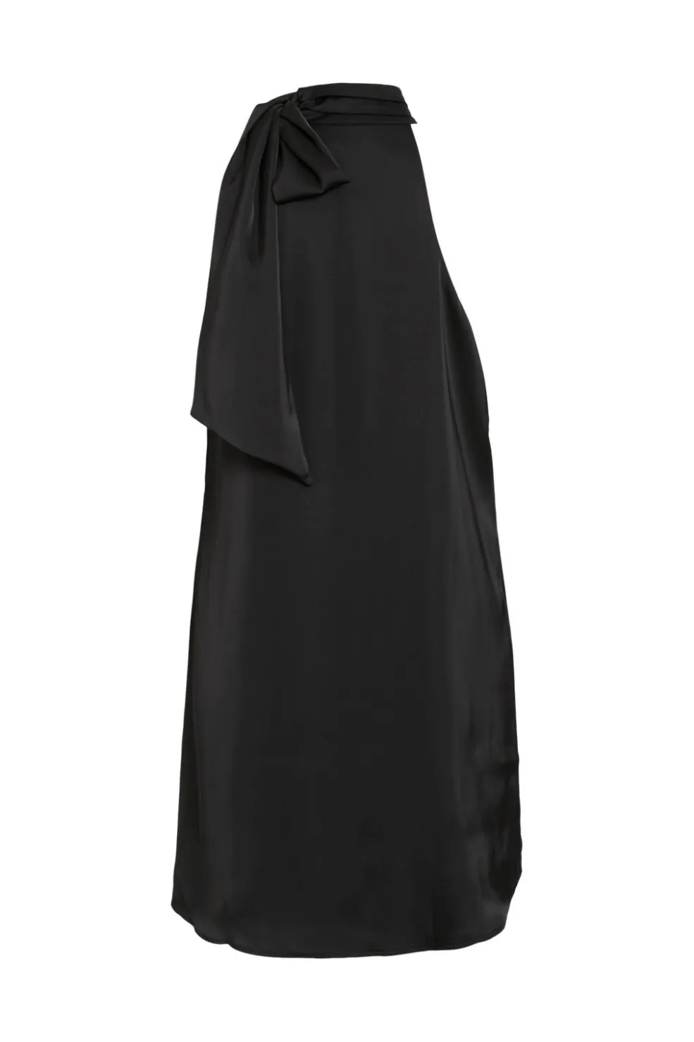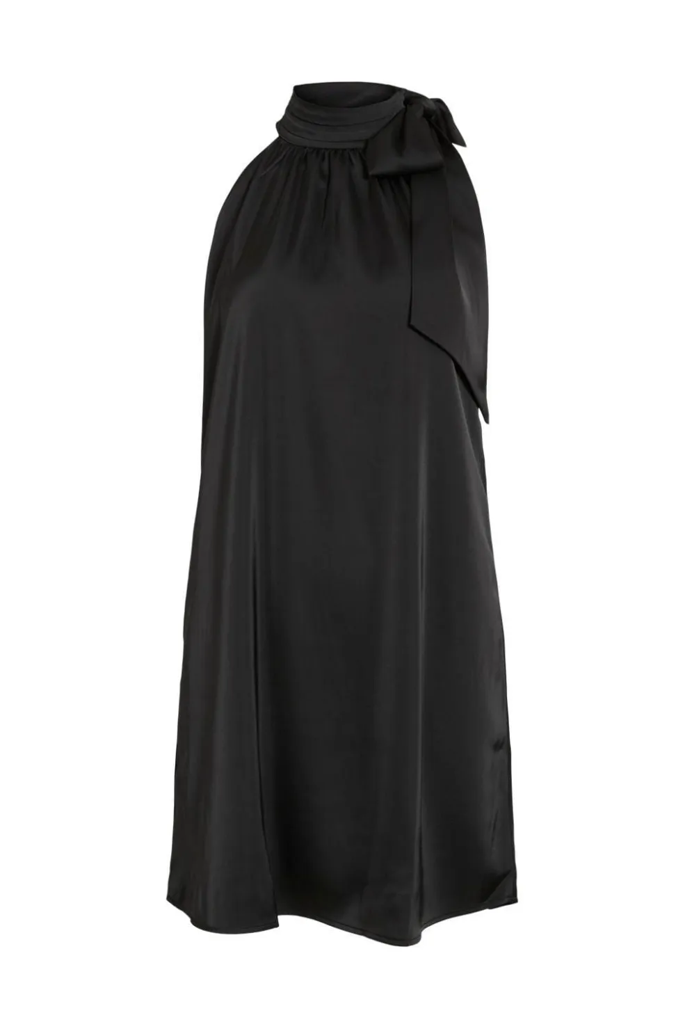 Sort kjole fra Vila med høj halsudskæring og sløjfedetalje ved skulderen. Den ærmeløse kjole har et A-formet snit og falder til midt på låret.