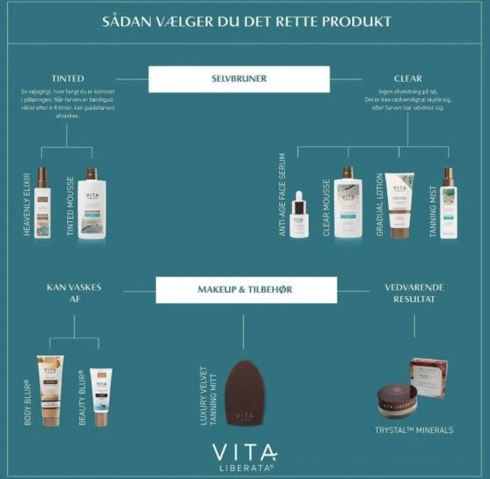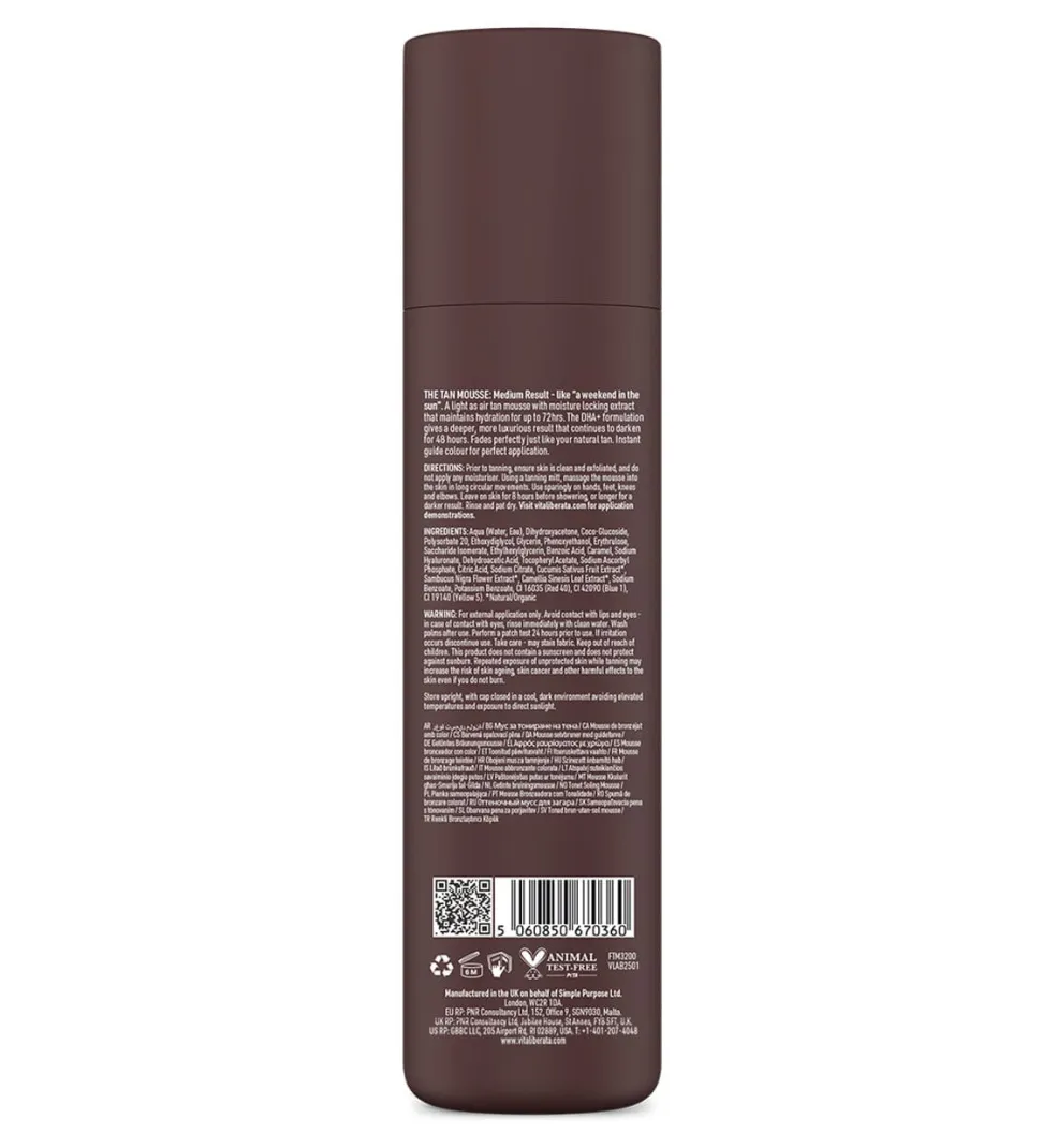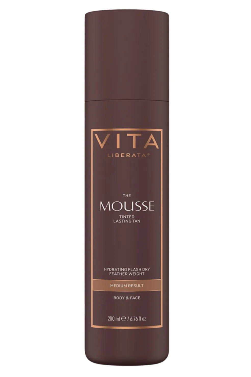 Selvbruner-mousse fra Vita Liberata med medium farveintensitet. En let mousse med guidefarve til præcis påføring, som giver en naturlig glød, der holder i op til 7 dage.
