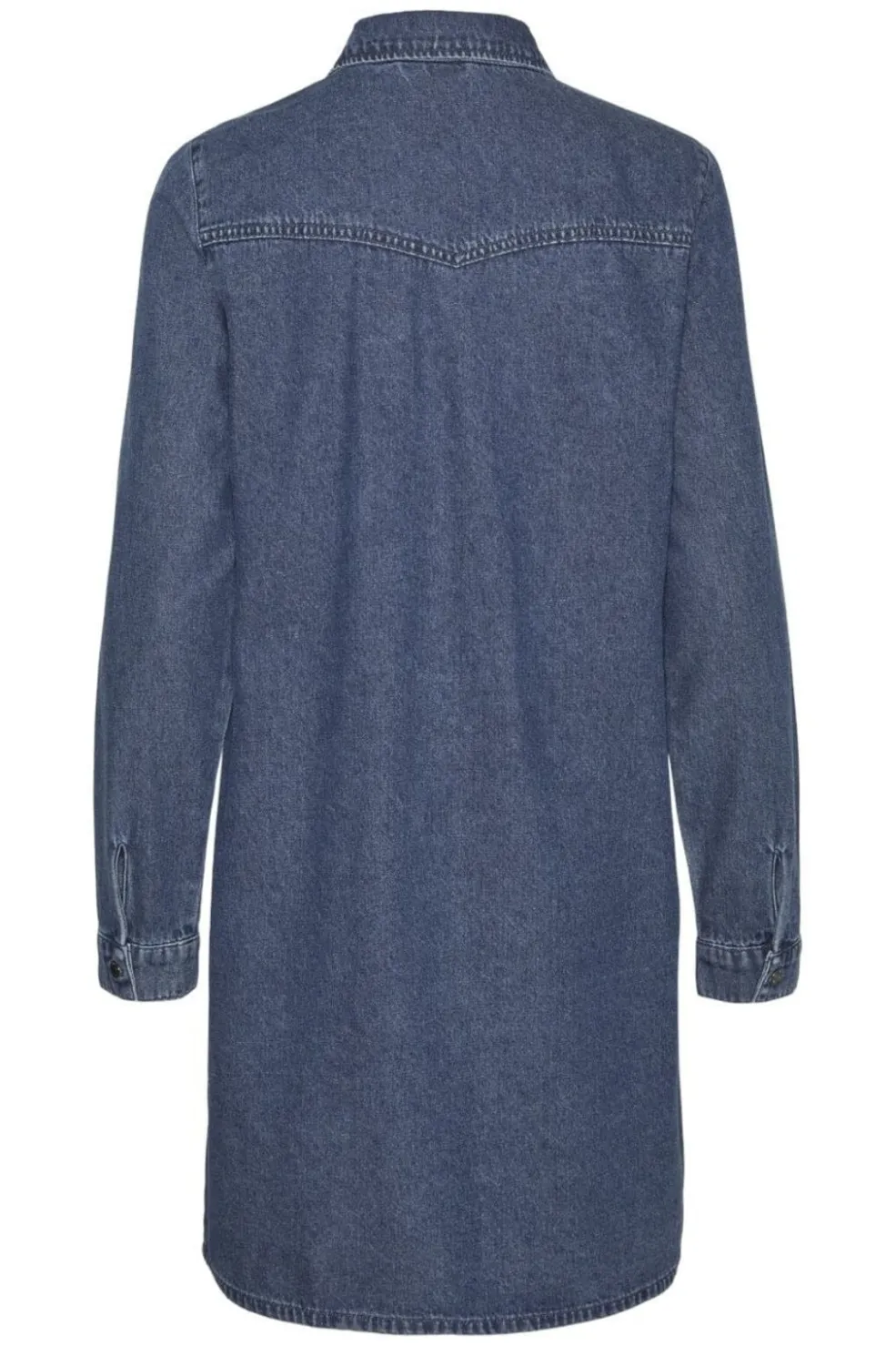 Denimkjole fra Vero Moda i mellemblå denim. Kjolen har skjortekrave, lange ærmer og knapper hele vejen ned. To brystlommer giver kjolen et praktisk præg.