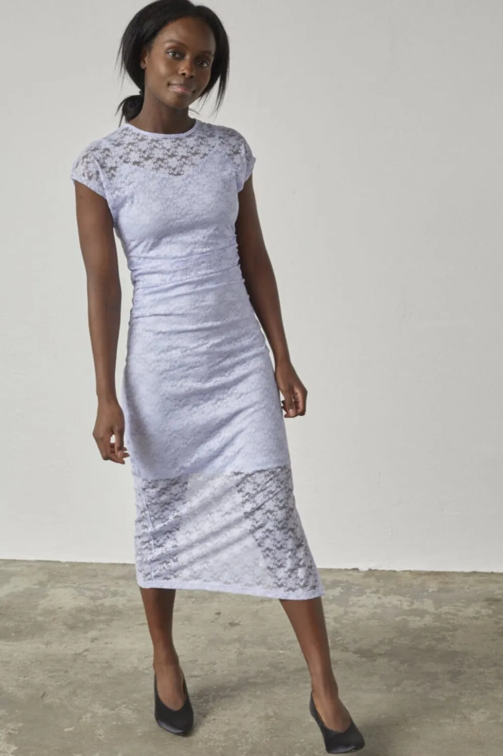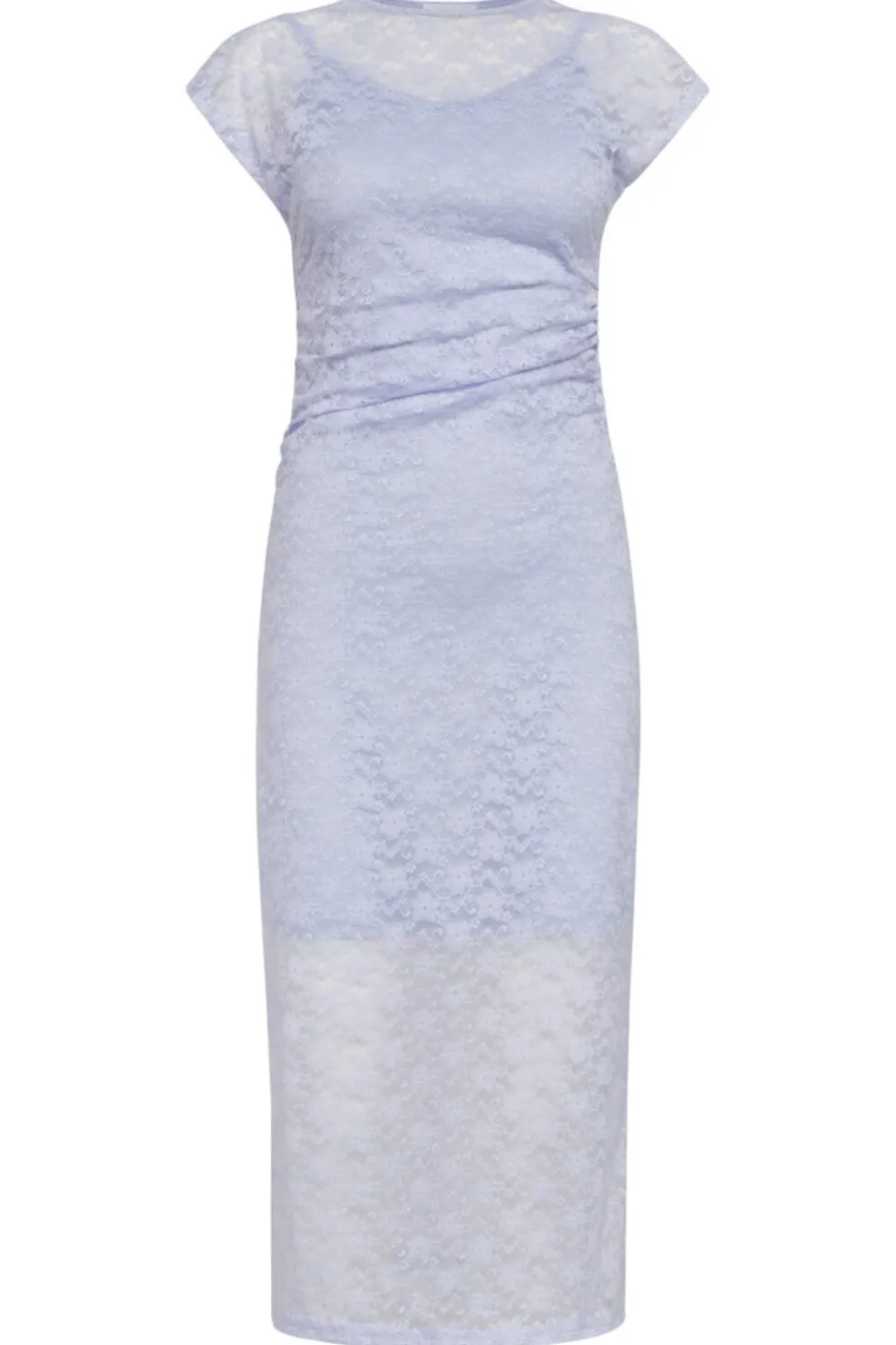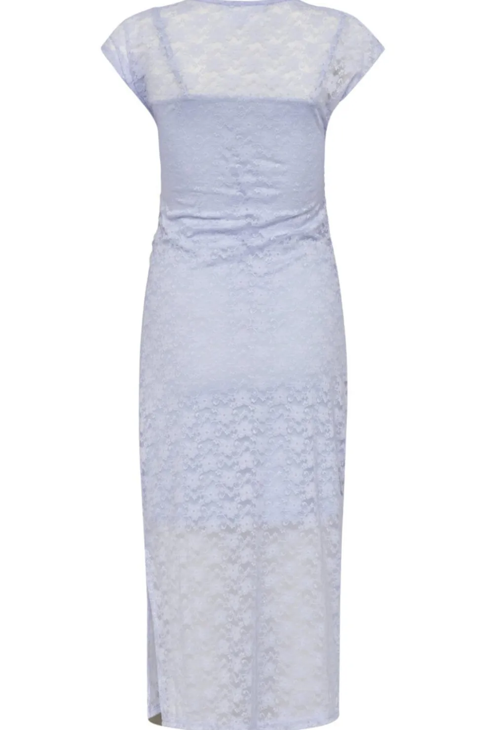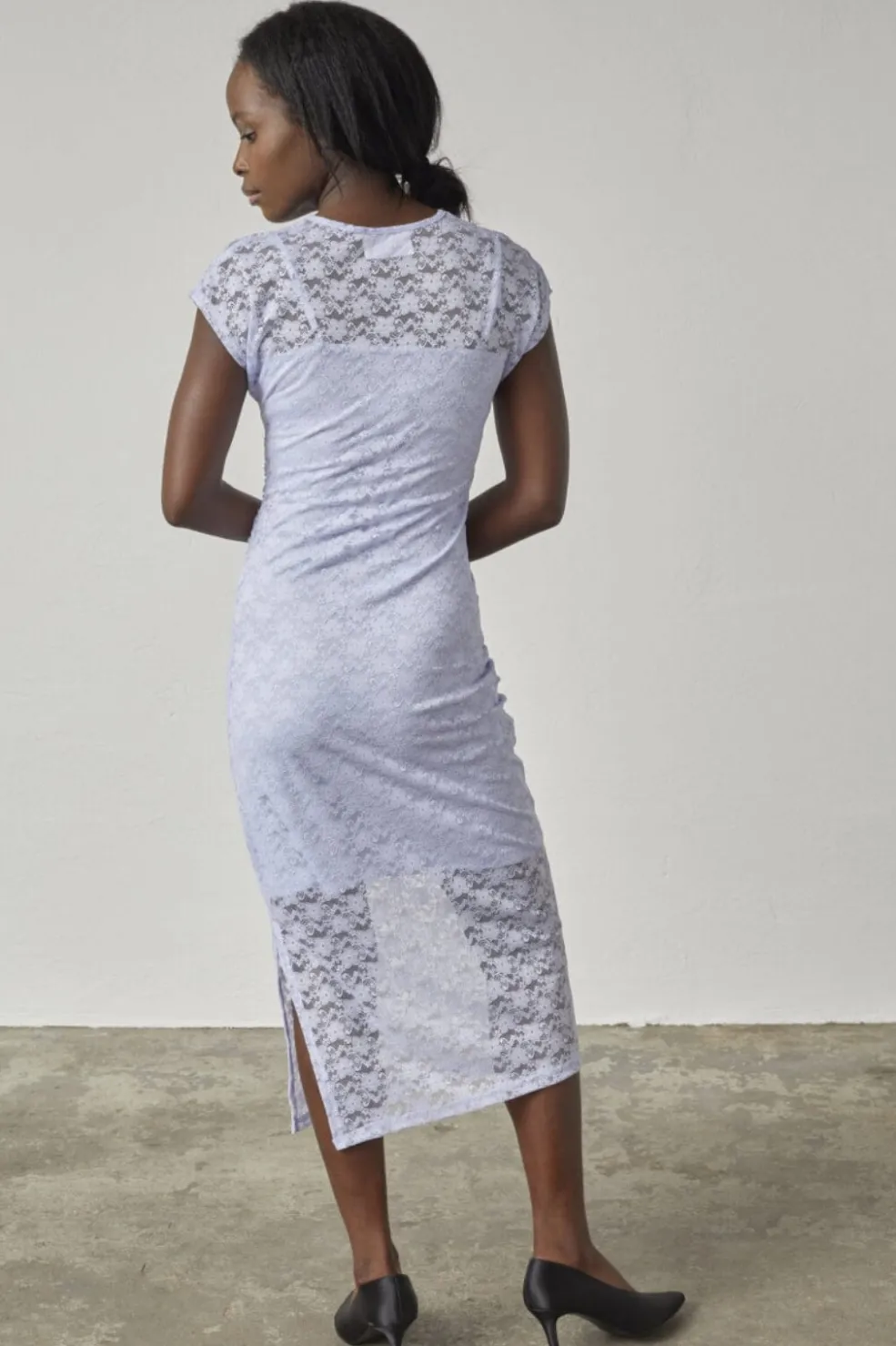 Blondekjole fra Sisters Point i lys lavendelnuance. Kjolen har rund halsudskæring og korte ærmer med gennemsigtige blondepaneler. En underkjole medfølger.