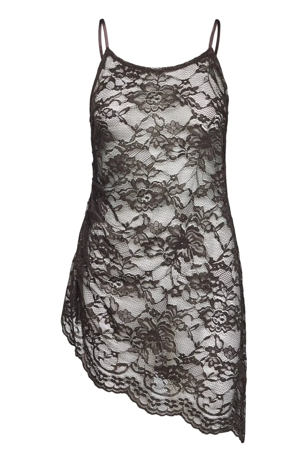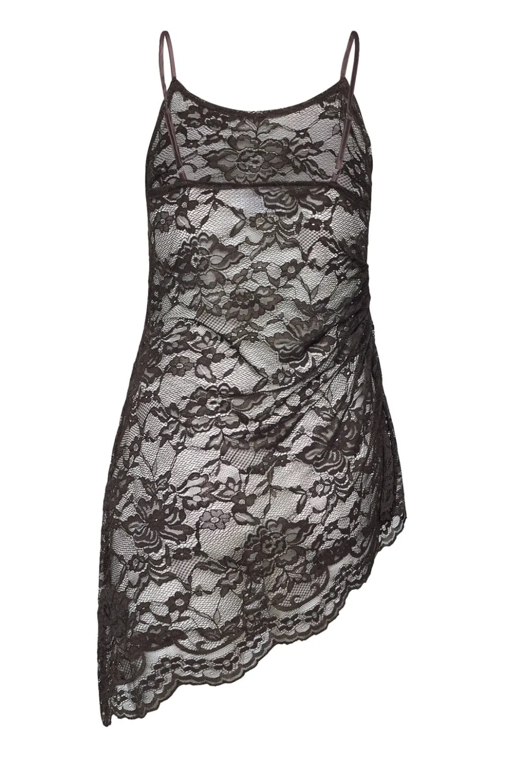 Blondekjole fra Sisters Point i en dyb brun nuance. Kjolen er gennemsigtig og har et heldækkende blomstret blondemønster.