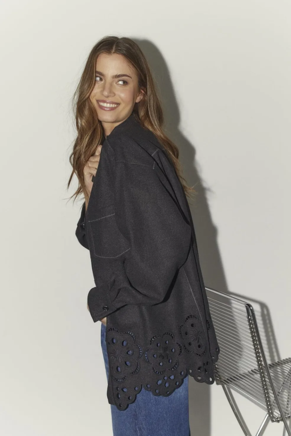 Mørkegrå skjorte fra Co´Couture, lavet af en blanding af polyester og uld. Skjorten har broderi langs bunden og en oversized pasform.