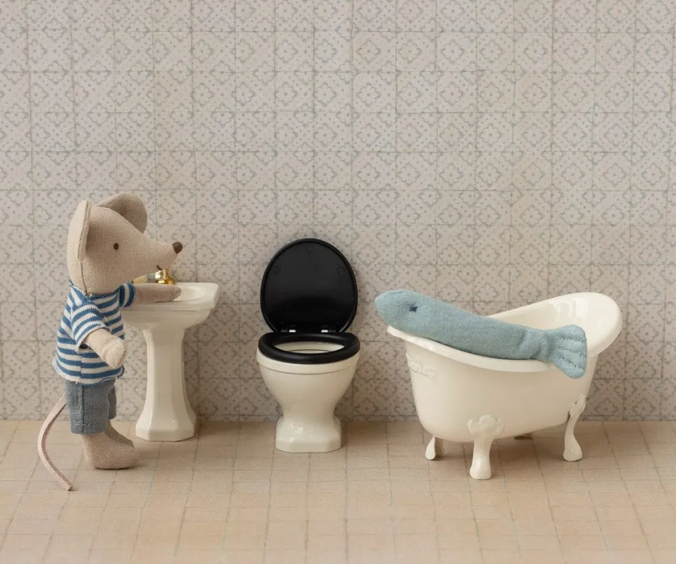 Toilettet passer ind i badeværelset i SuitCasa-musehuset. Metal og ABS-plast gør det holdbart til leg.